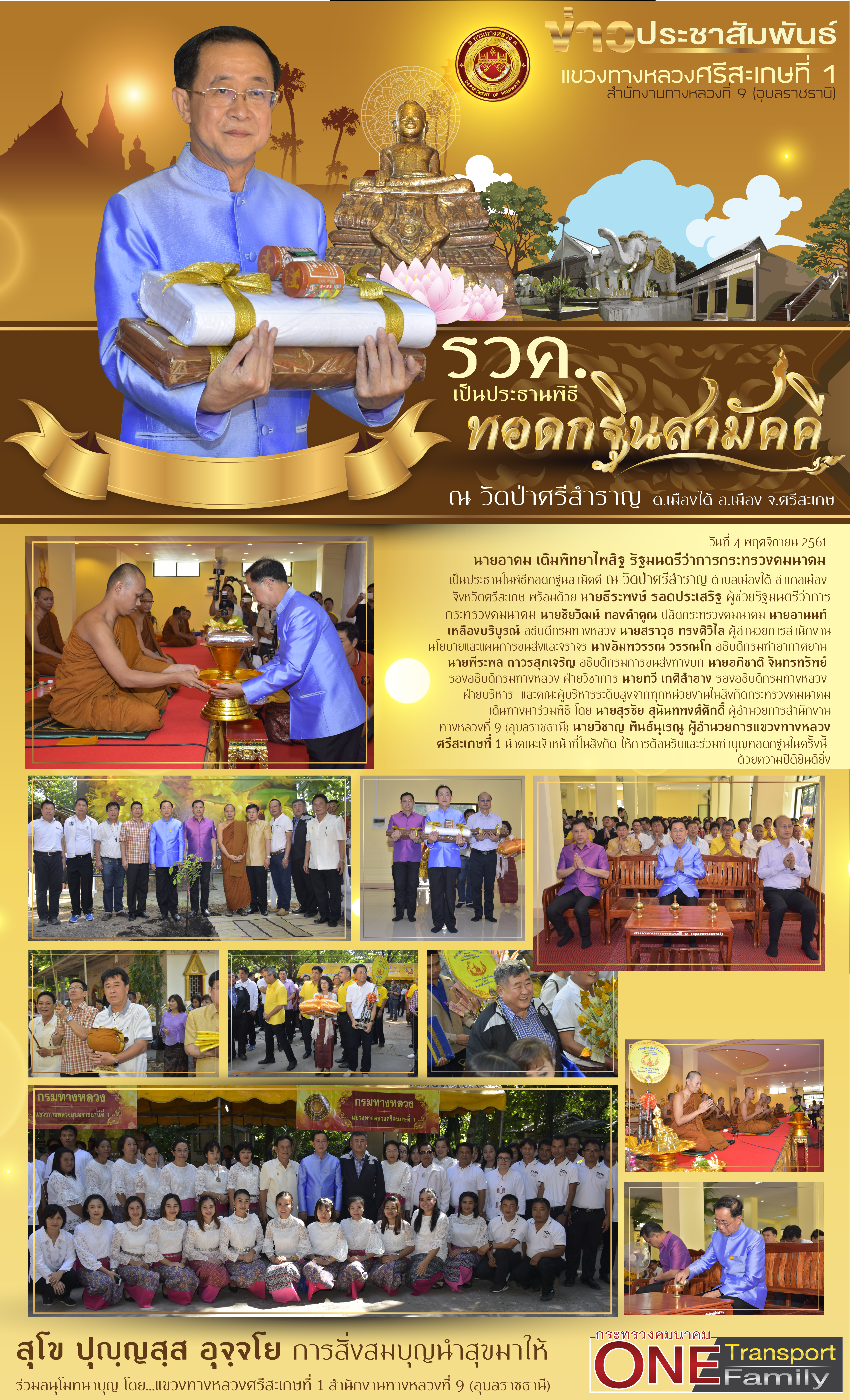 นายอาคม เติมพิทยาไพสิฐ รัฐมนตรีว่าการกระทรวงคมนาคม เป็นประธานในพิธีทอดกฐินสามัคคี ณ วัดป่าศรีสำราญ ตำบลเมืองใต้ อำเภอเมือง จังหวัดศรีสะเกษ |