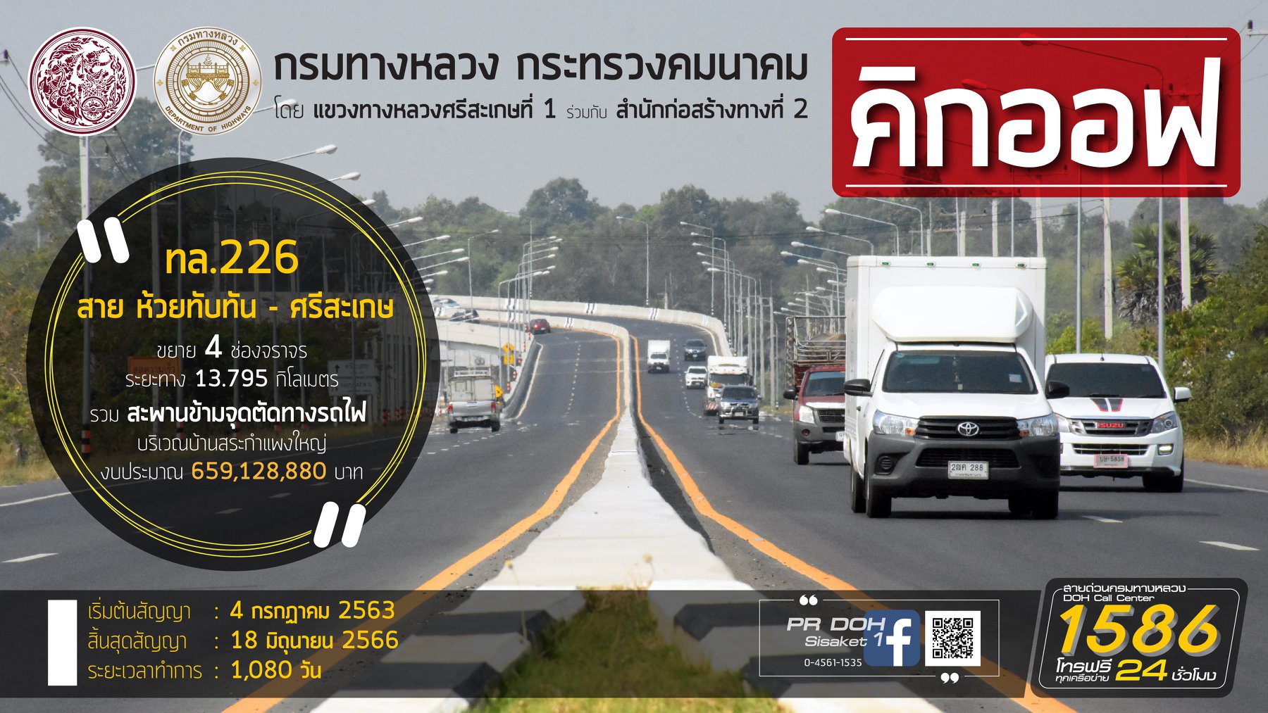 ขอให้ผู้ใช้เส้นทางโปรดใช้ความระมัดระวังในการใช้เส้นทางสัญจรผ่านและขออภัยในความ ไม่สะดวกมา ณ ที่นี้ สามารถสอบถามข้อมูลเพิ่มเติมได้ที่แขวงทางหลวงศรีสะเกษที่ 1