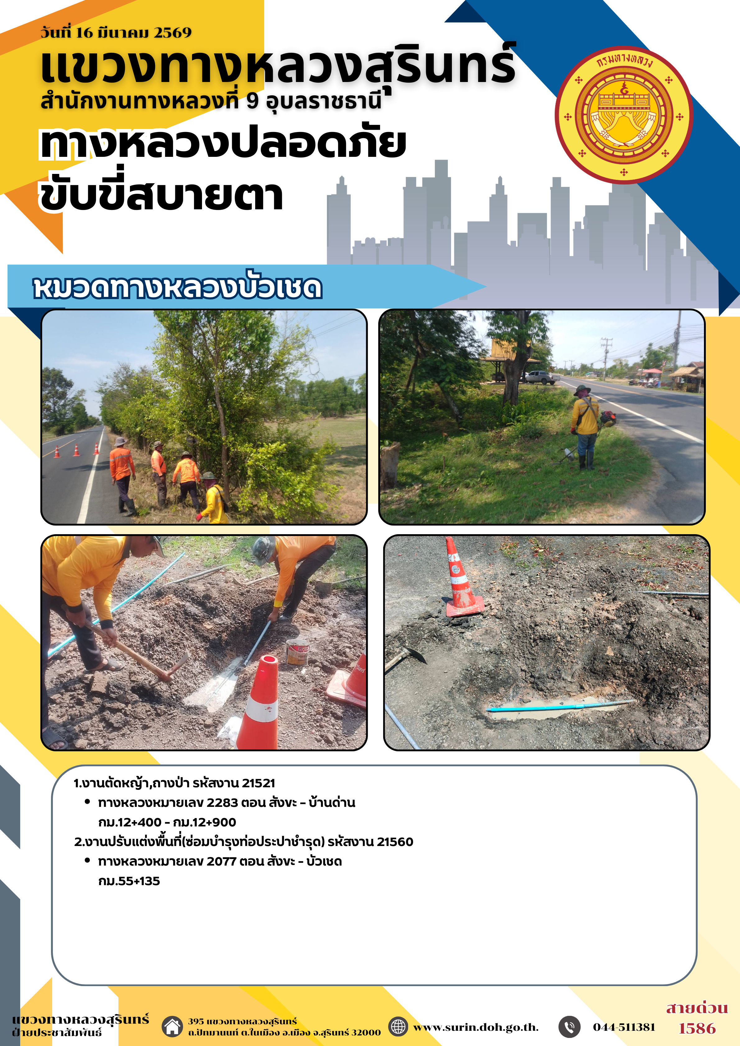 ทางหลวงปลอดภัย ขับขี่สบายตา 16 มีนาคม 2569 |