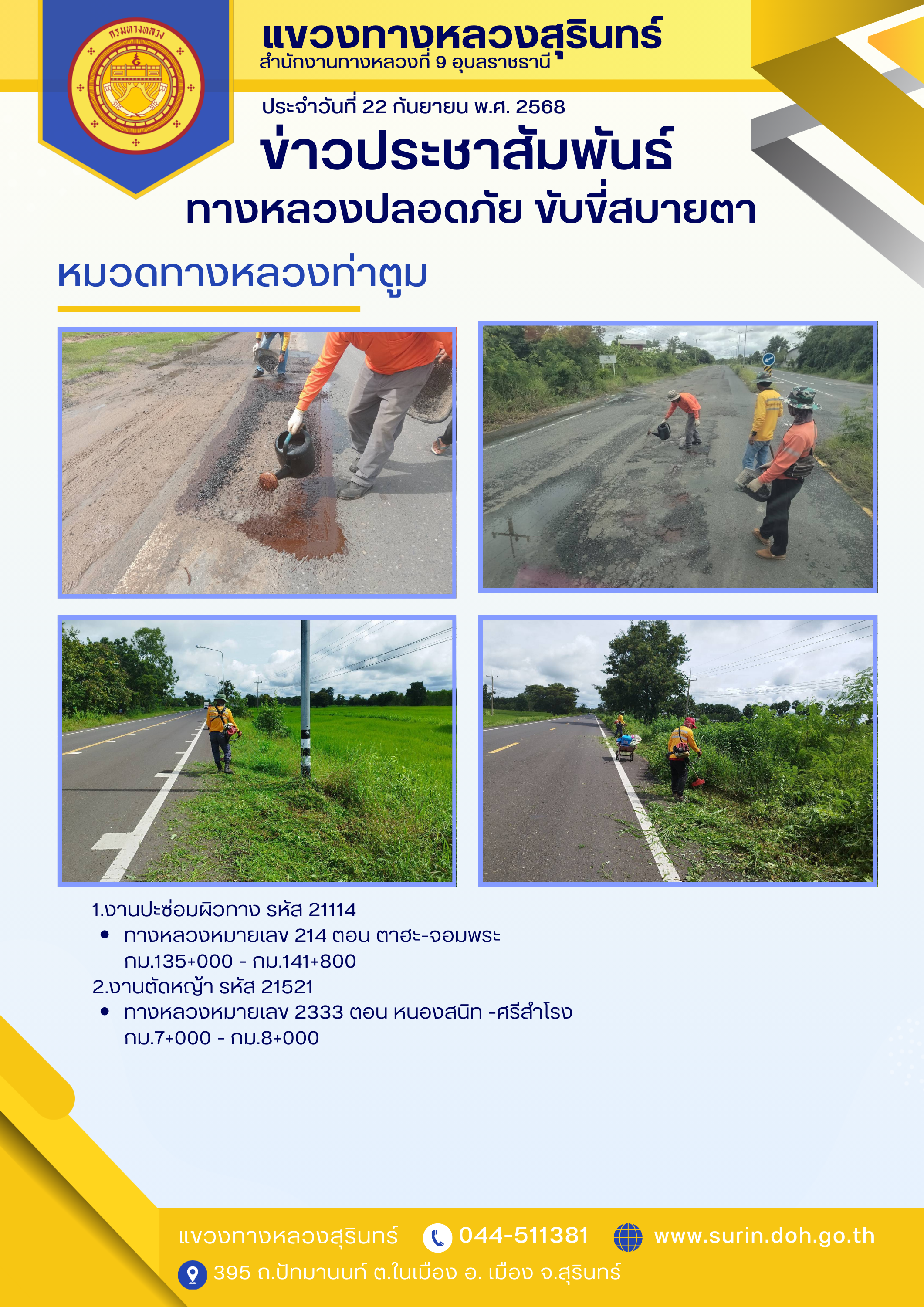 ทางหลวงปลอดภัย ขับขี่สบายตา 22 กันยายน 2568 |