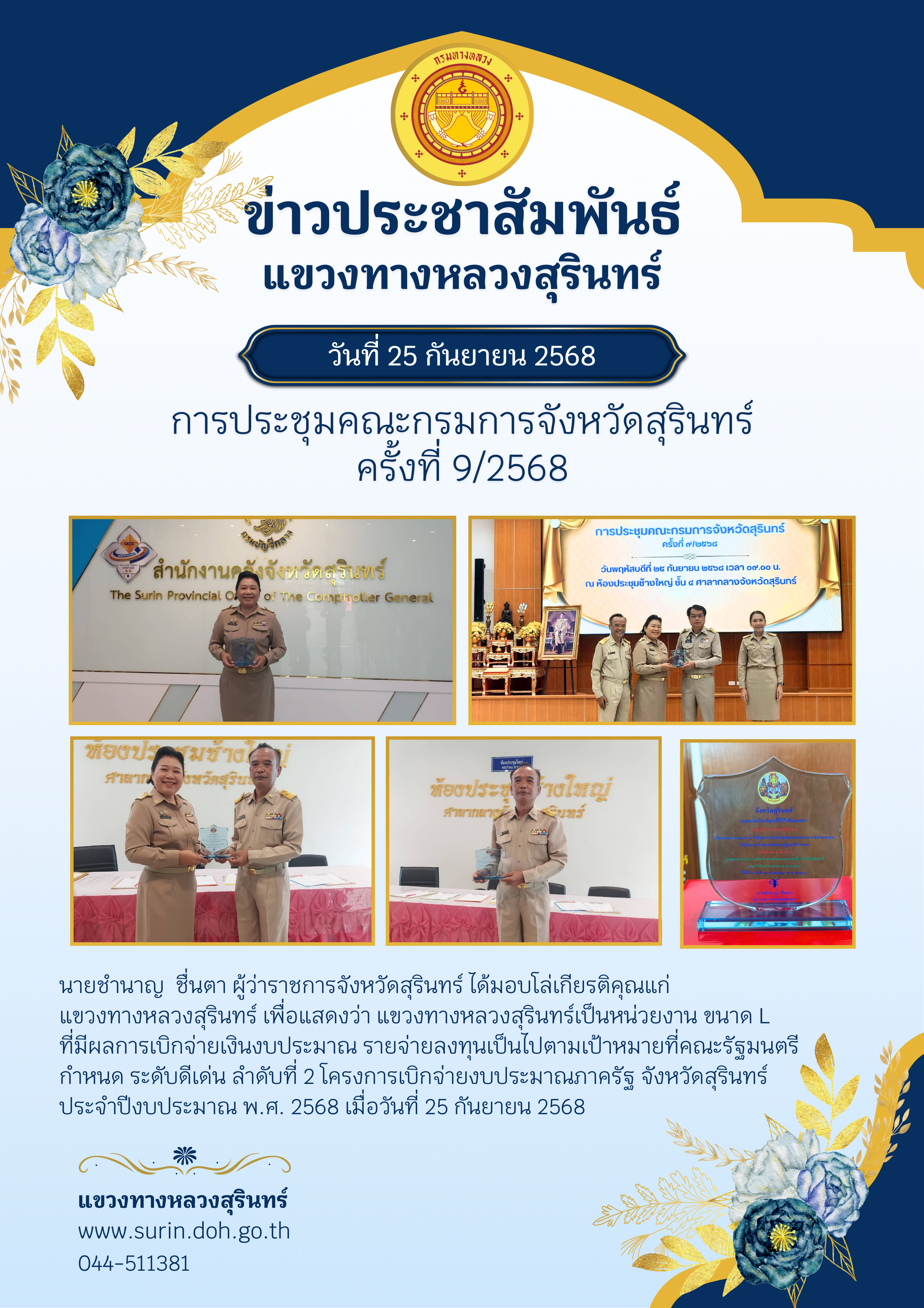 หน่วยงานเบิกจ่าย ระดับดีเด่น อันดับ 2 ของจังหวัดสุรินทร์ |