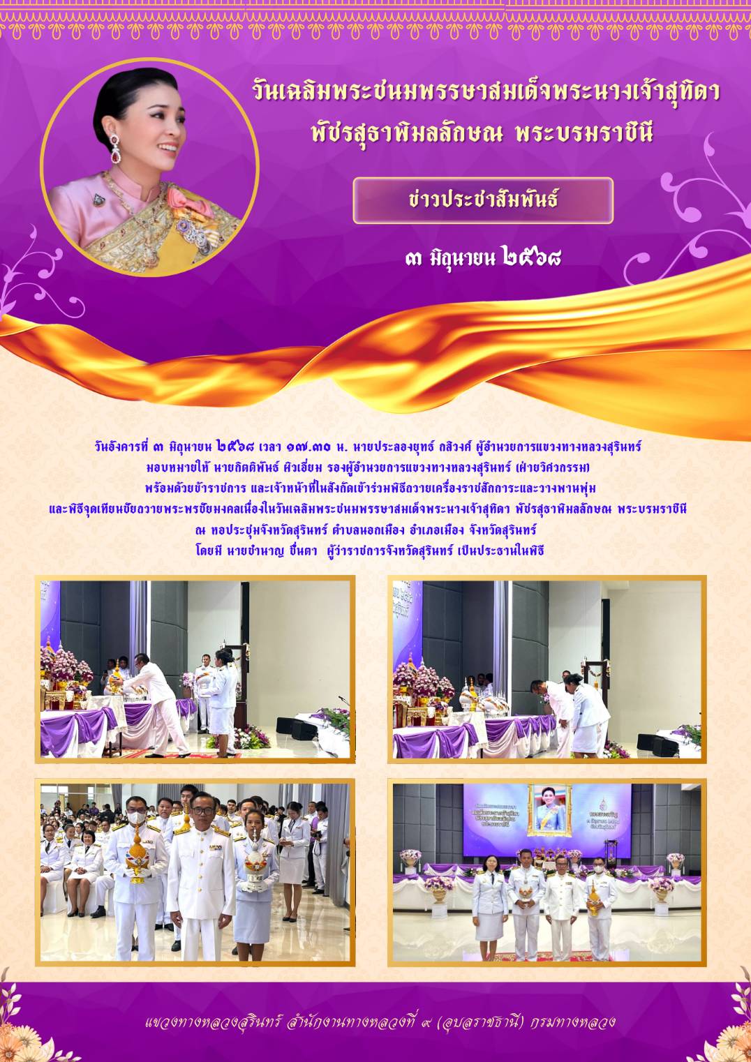 พิธีถวายเครื่องราชสักการะและวางพานพุ่ม และพิธีจุดเทียนชัยถวายพระพรชัยมงคลเนื่องในวันเฉลิมพระชนมพรรษาสมเด็จพระนางเจ้าสุทิดา พัชรสุธาพิมลลักษณ พระบรมราชินี