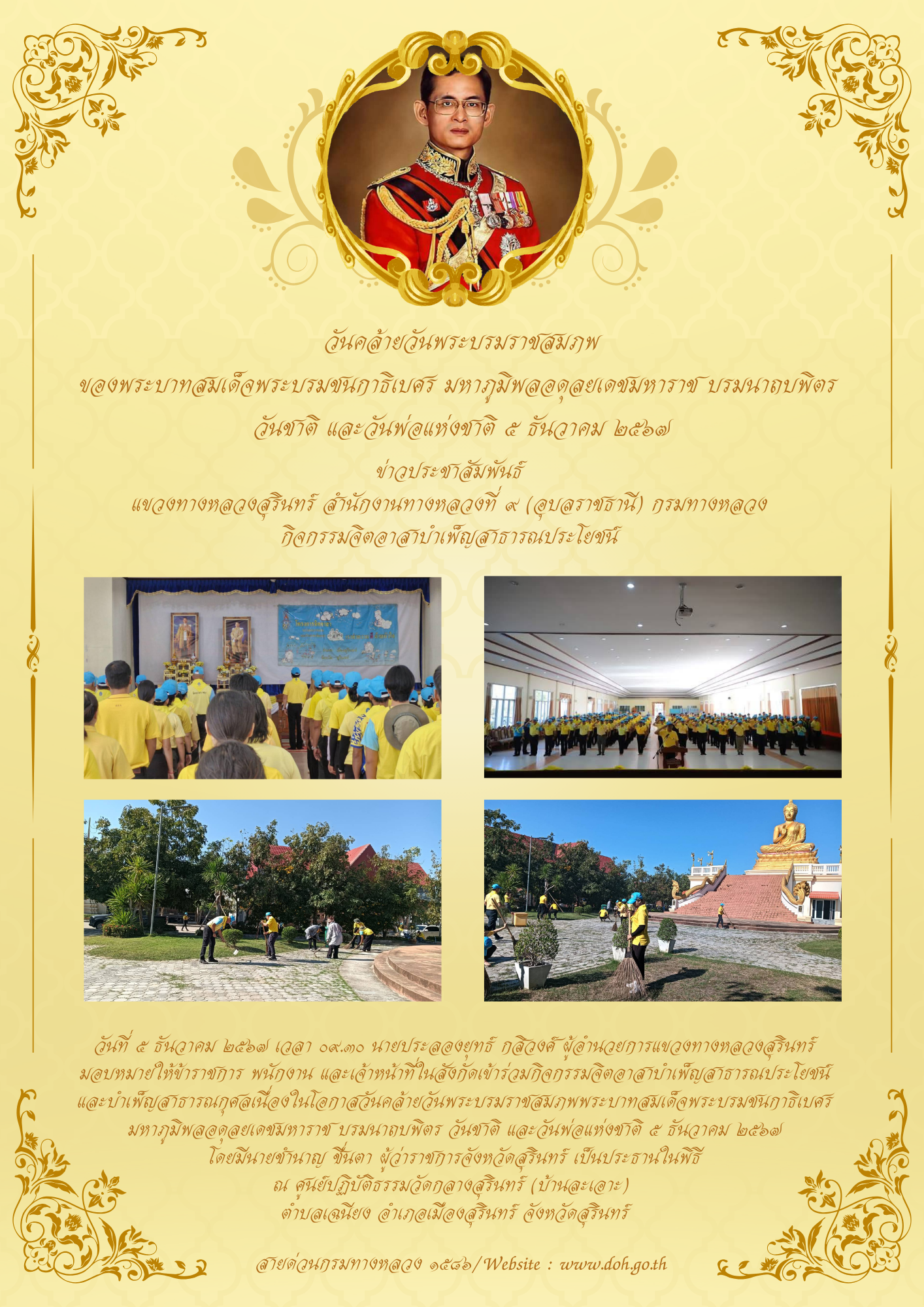 กิจกรรมจิตอาสาบำเพ็ญสาธารณประโยชน์ และบำเพ็ญสาธารณกุศลเนื่องในโอกาสวันคล้ายวันพระบรมราชสมภพพระบาทสมเด็จพระบรมชนกาธิเบศร มหาภูมิพลอดุลยเดชมหาราช บรมนาถบพิตร
