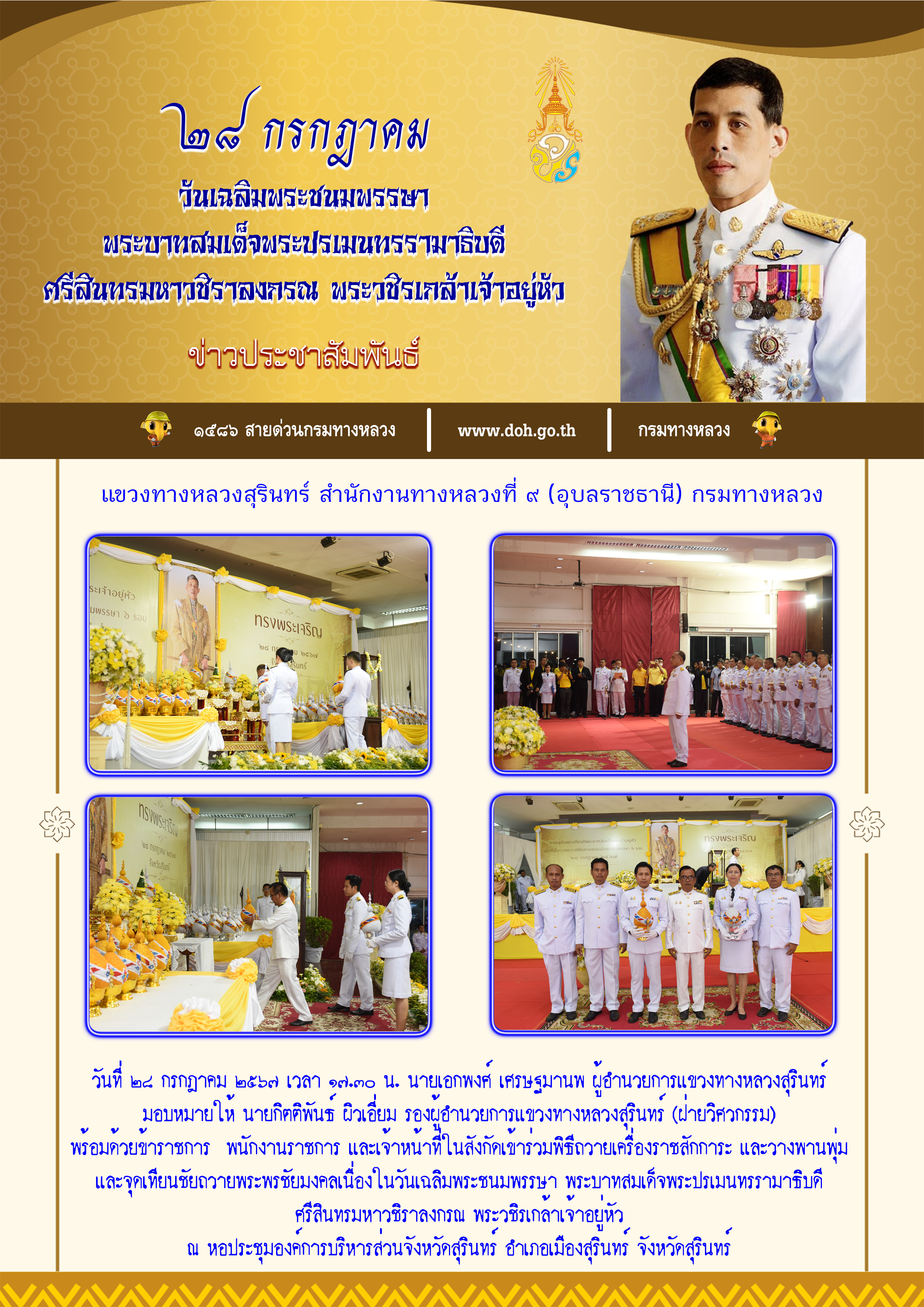 พิธีถวายเครื่องราชสักการะ และวางพานพุ่ม และจุดเทียนชัยถวายพระพรชัยมงคลเนื่องในวันเฉลิมพระชนมพรรษา พระบาทสมเด็จพระปรเมนทรรามาธิบดี ศรีสินทรมหาวชิราลงกรณ พระวชิรเกล้าเจ้าอยู่หัว