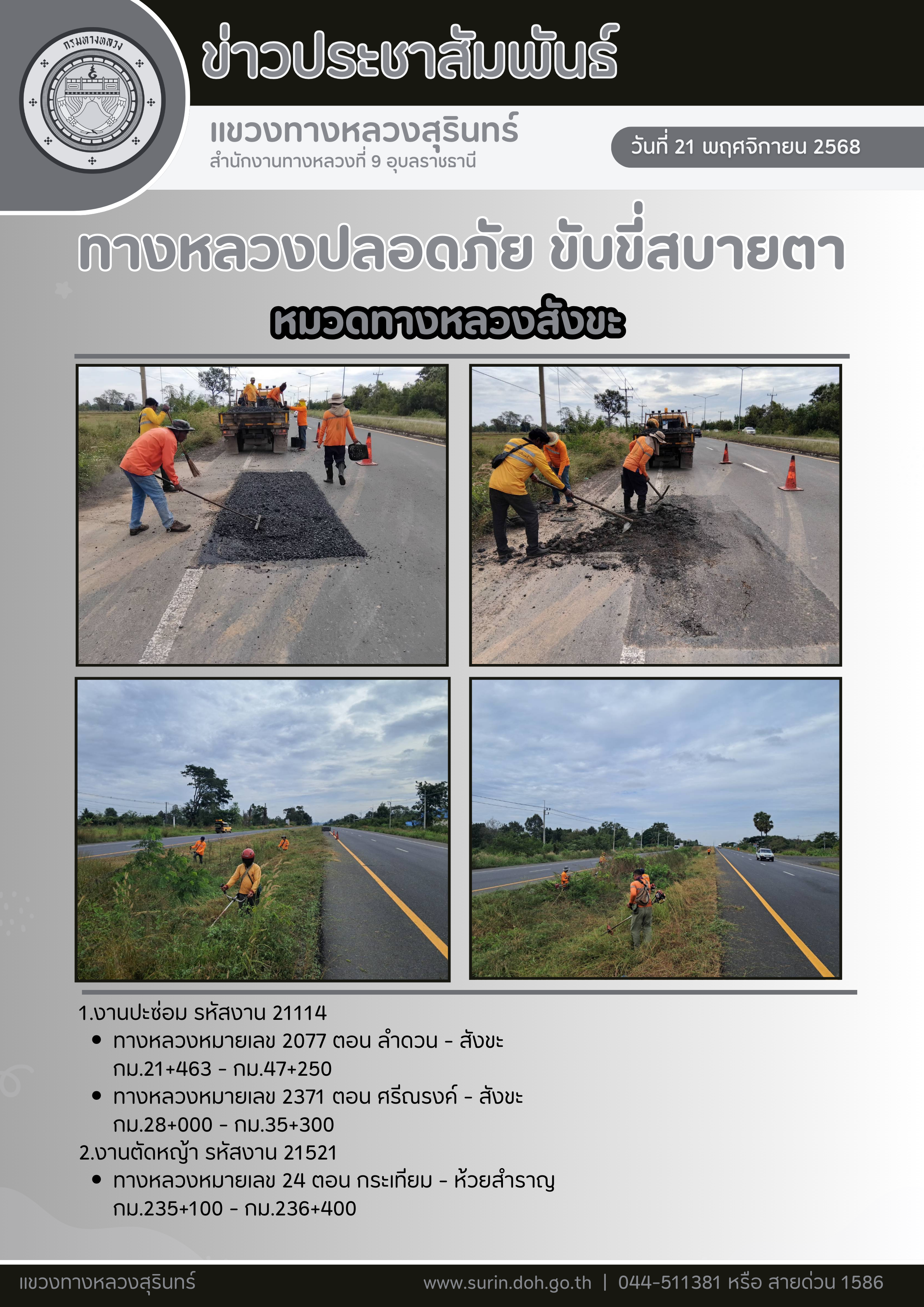 ทางหลวงปลอดภัย ขับขี่สบายตา 21 พฤศจิกายน 2568 |