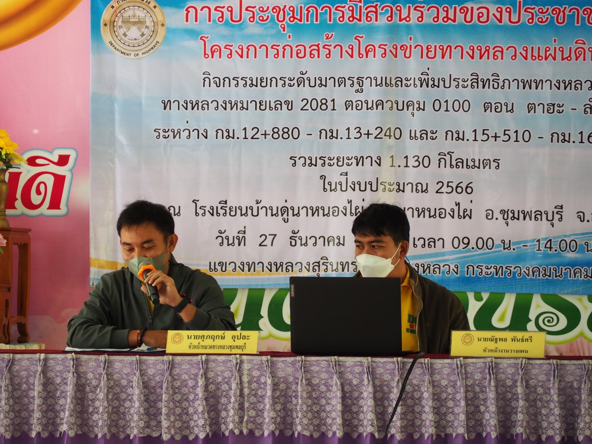 แขวงทางหลวงสุรินทร์ ได้ดำเนินการจัดการมีส่วนร่วมของประชาชน ปีงบประมาณ 2566 โครงการก่อสร้างโครงข่ายทางหลวงแผ่นดิน สำหรับ กิจกรรมยกระดับมาตรฐานและเพิ่มประสิทธิภาพทางหลวง ทางหลวงหมายเลข 2081 ตอนควบคุม 0100 ตอน ตาฮะ - ลำพังชู ระหว่าง กม.12+880 - กม.13+240 และ กม.15+510 - กม.16+280 ระยะทาง 1.130 กิโลเมตร โดยดำเนินการประชุมในวันอังคาร ที่ 27 ธันวาคม 2565 เวลา 09.00 น. - 14.00 น. ณ โรงเรียนบ้านดู่นาหนองไผ่ ตำบลไพรขลา อำเภอชุมพลบุรี จังหวัดสุรินทร์ เสร็จเรียบร้อยแล้ว