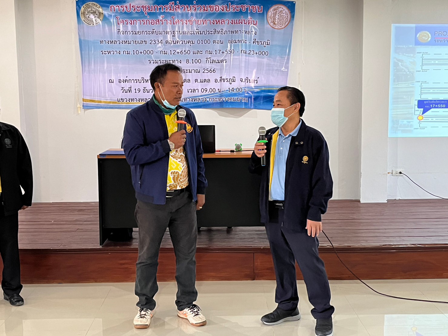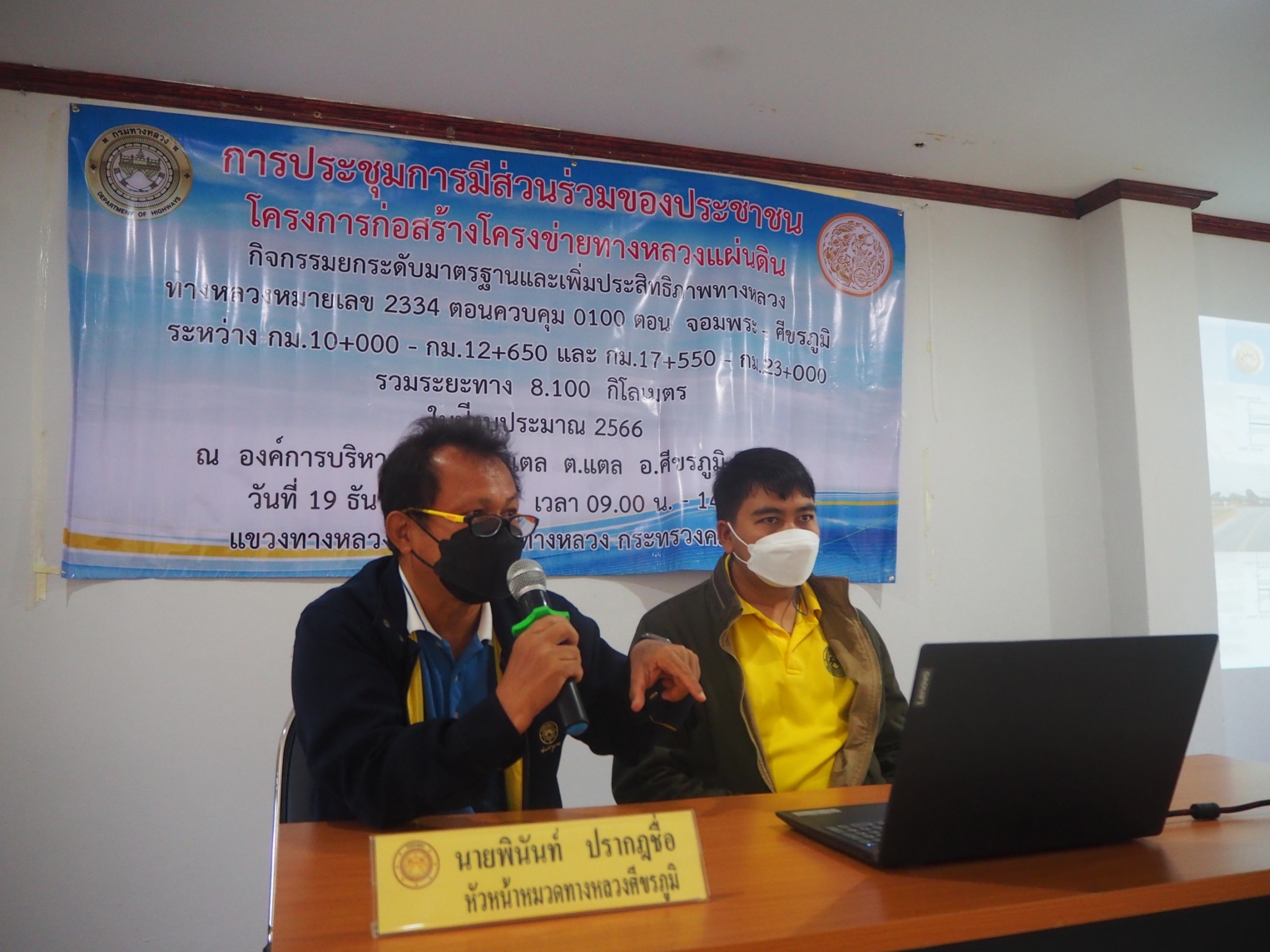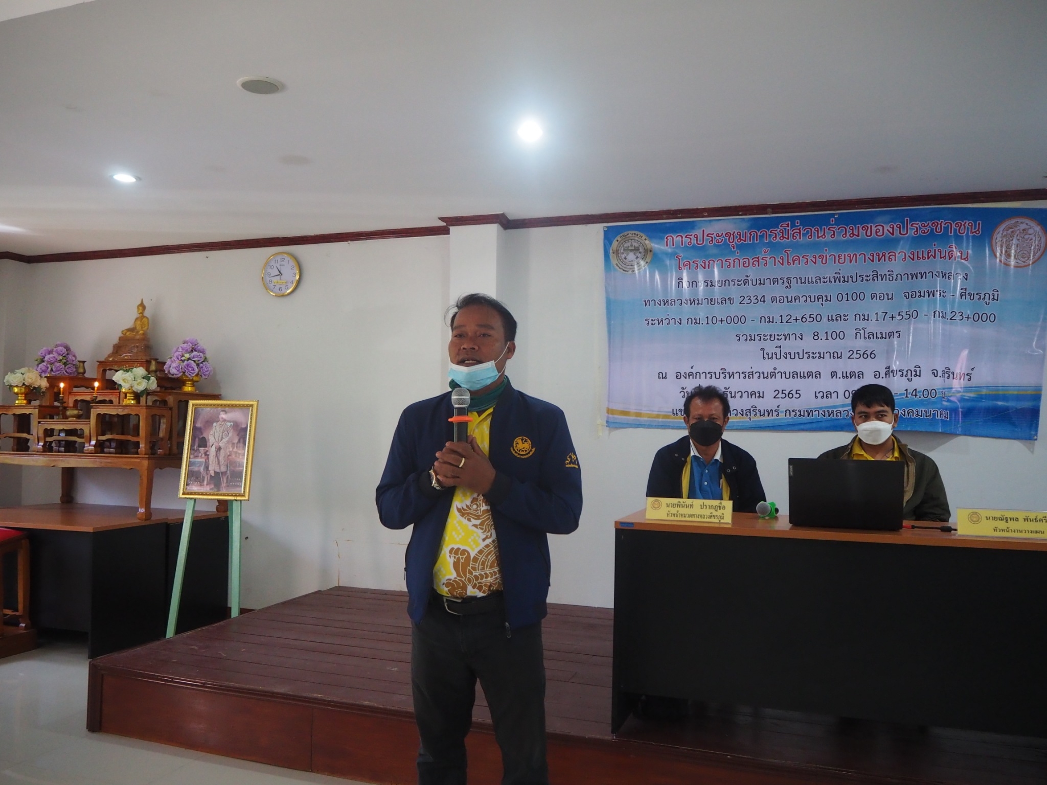 แขวงทางหลวงสุรินทร์ ได้ดำเนินการจัดการมีส่วนร่วมของประชาชน ปีงบประมาณ 2566 โครงการก่อสร้างโครงข่ายทางหลวงแผ่นดิน สำหรับ กิจกรรมยกระดับมาตรฐานและเพิ่มประสิทธิภาพทางหลวง ทางหลวงหมายเลข 2334 ตอนควบคุม 0100 ตอน จอมพระ – ศีขรภูมิ ระหว่าง กม.10+000 - กม.12+650 และ กม.17+550 - กม.23+000 ระยะทาง 8.100 กิโลเมตร โดยดำเนินการประชุมในวันจันทร์ ที่ 19 ธันวาคม 2565 เวลา 09.00 น. - 14.00 น. ณ องค์การบริหารส่วนตำบลแตล ตำบลแตล อำเภอศีขรภูมิ จังหวัดสุรินทร์ เสร็จเรียบร้อยแล้ว