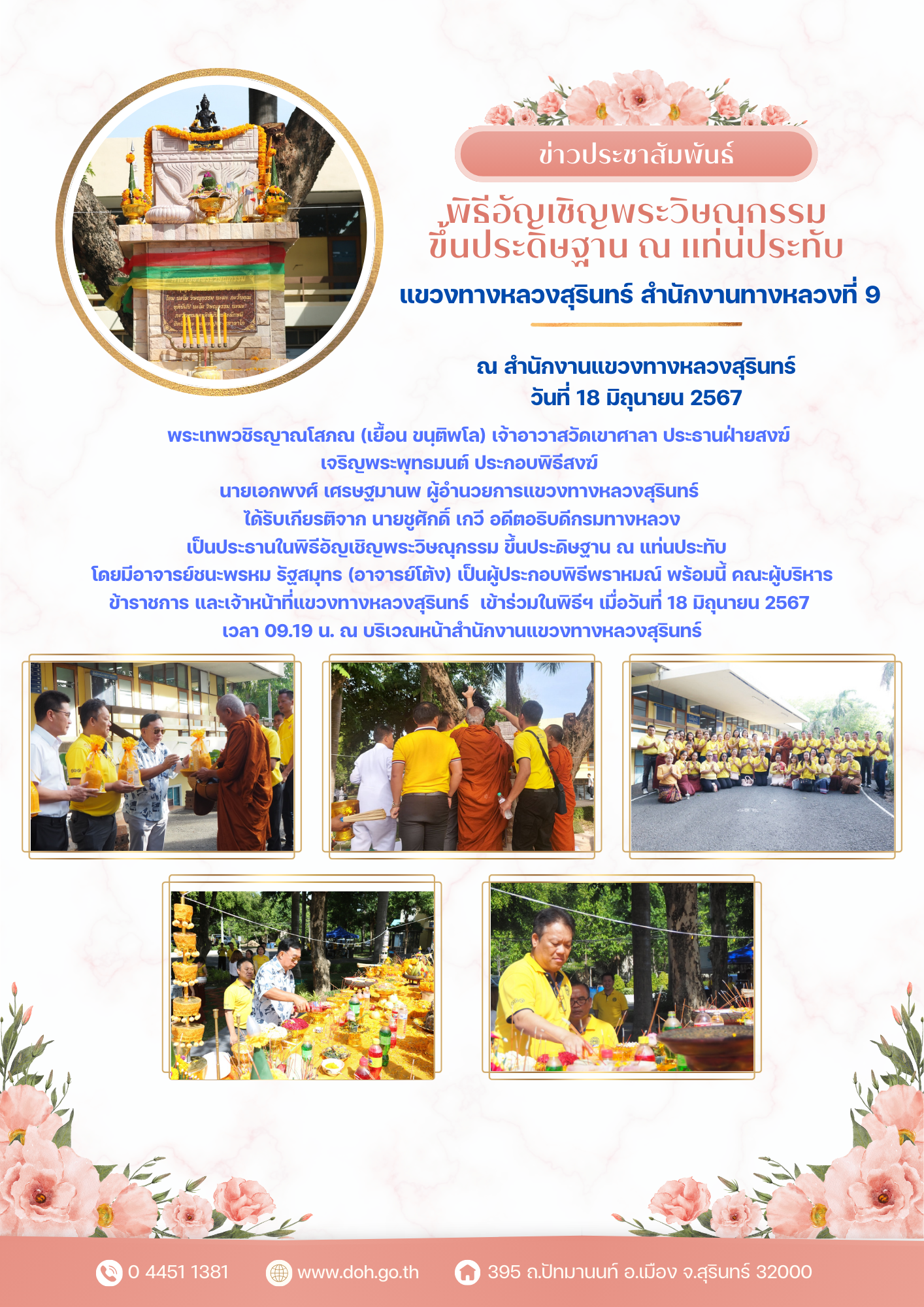 โดยมีอาจารย์ชนะพรหม รัฐสมุทร (อาจารย์โต้ง) เป็นผู้ประกอบพิธีพราหมณ์ พร้อมนี้ คณะผู้บริหาร ข้าราชการ และเจ้าหน้าที่แขวงทางหลวงสุรินทร์ เข้าร่วมในพิธีฯ เมื่อวันที่ 18 มิถุนายน 2567 เวลา 09.19 น. ณ บริเวณหน้าสำนักงานแขวงทางหลวงสุรินทร์