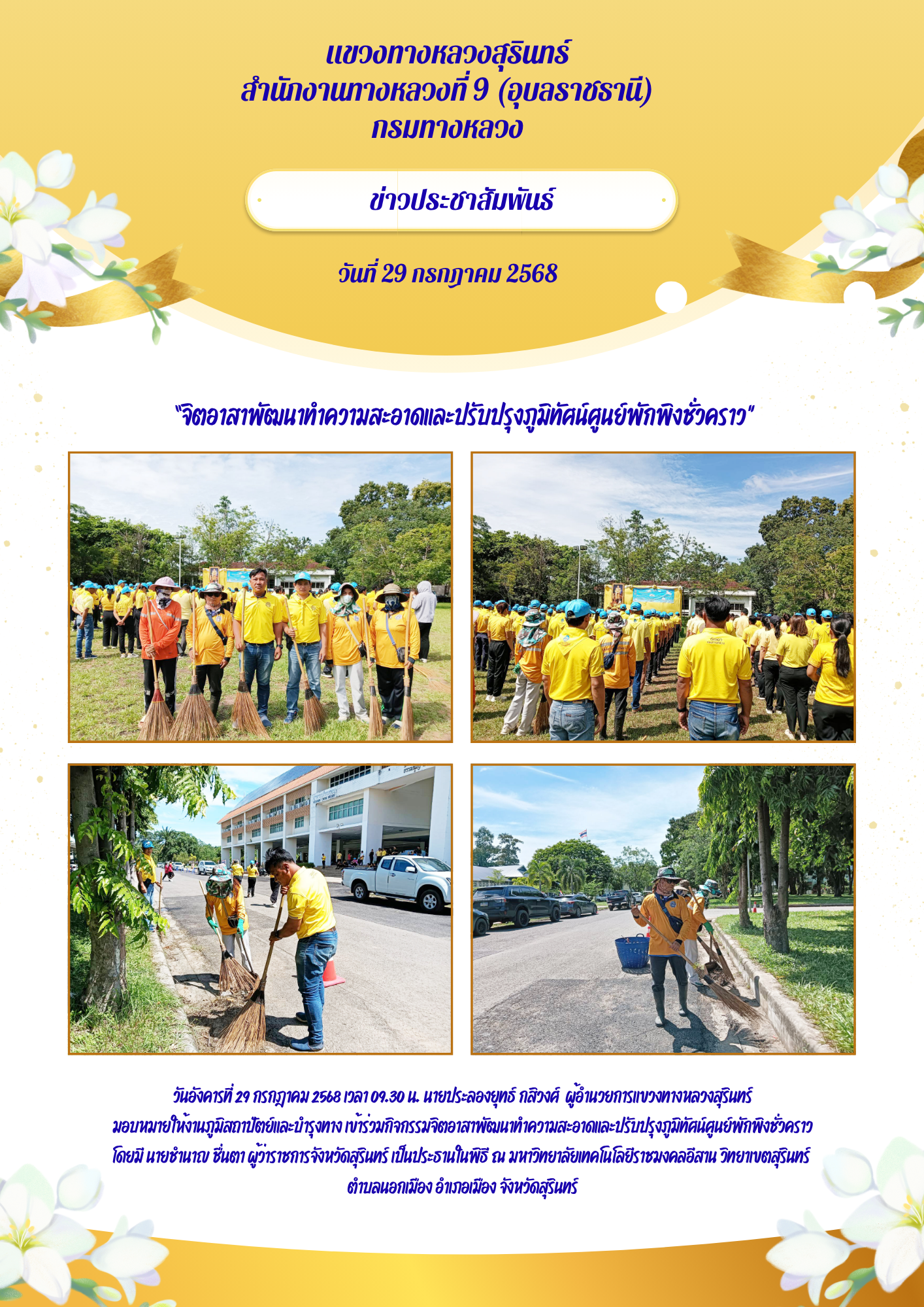 วันอังคารที่ 29 กรกฎาคม 2568 เวลา 09.30 น. นายประลองยุทธ์ กสิวงศ์ ผู้อำนวยการแขวงทางหลวงสุรินทร์