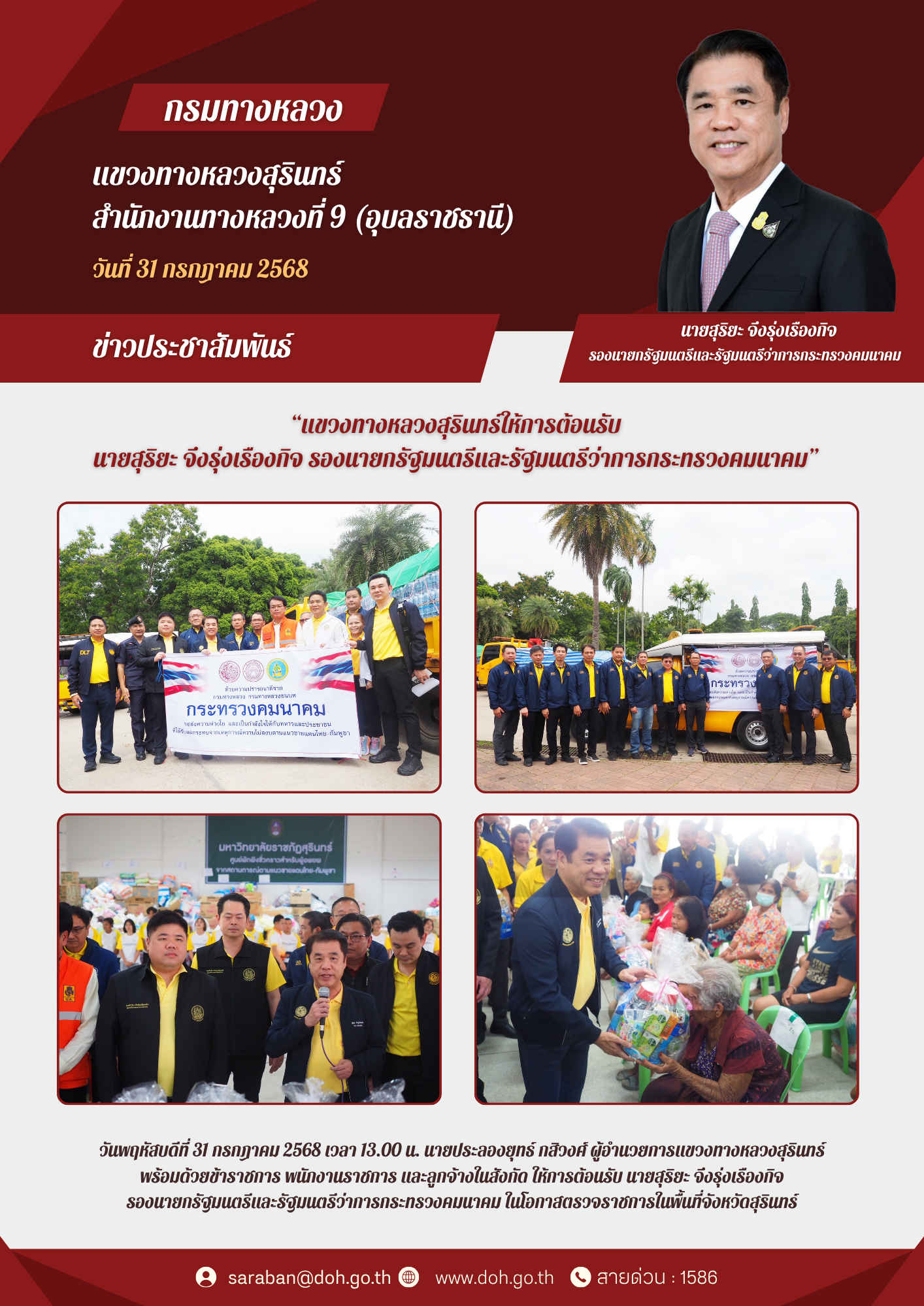 วันพฤหัสบดีที่ 31 กรกฎาคม 2568 เวลา 13.00 น. นายประลองยุทธ์ กสิวงศ์ ผู้อำนวยการแขวงทางหลวงสุรินทร์