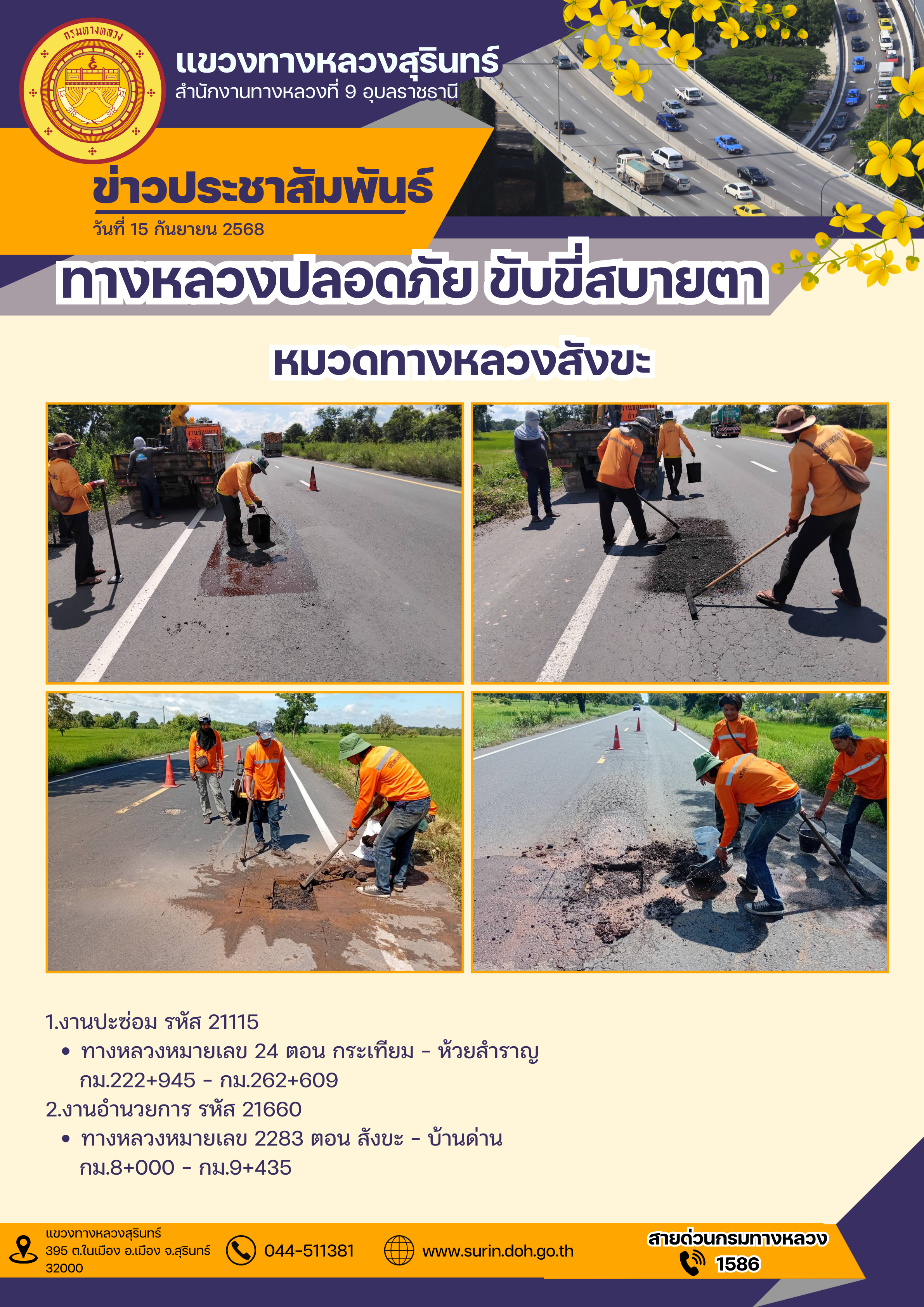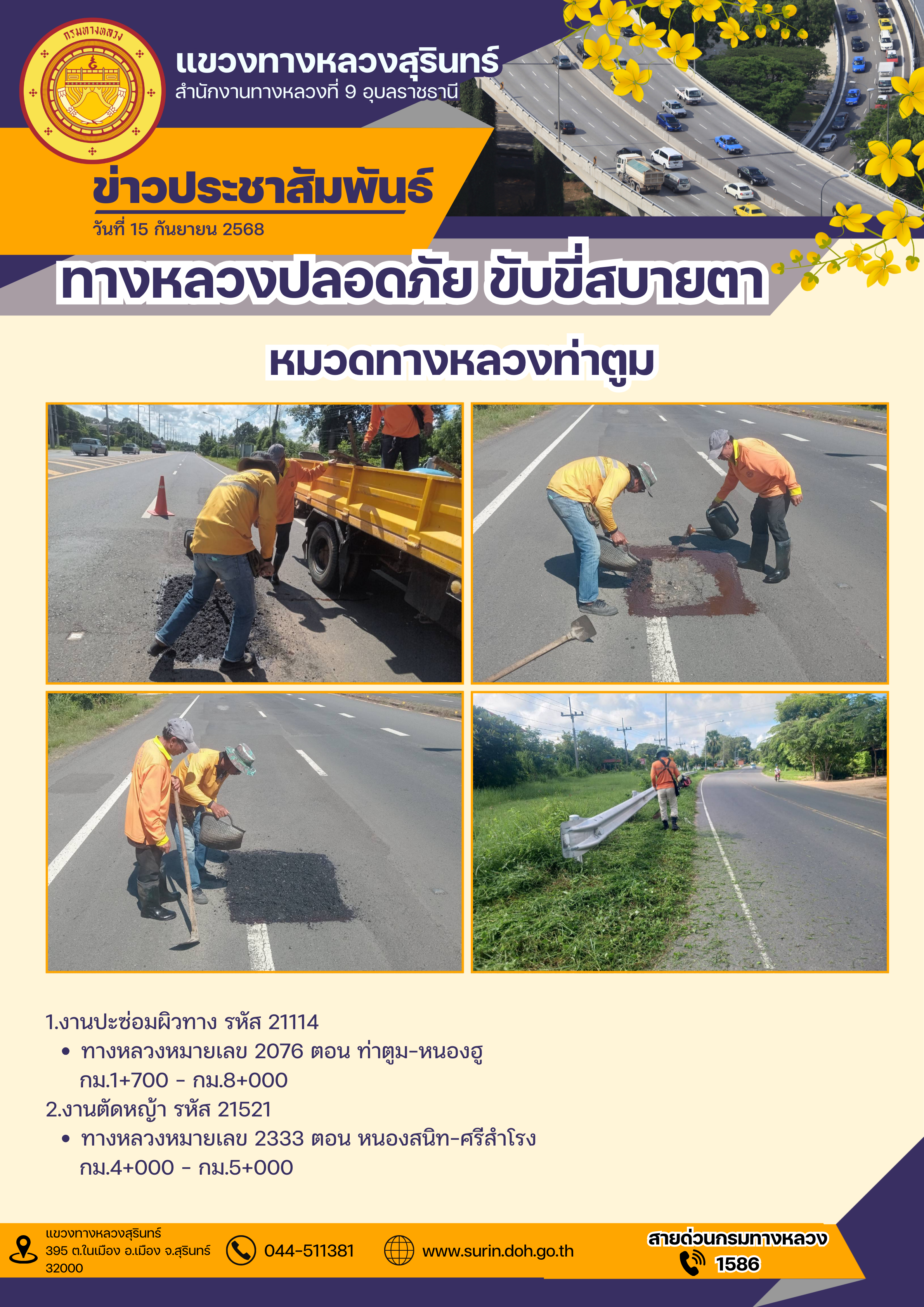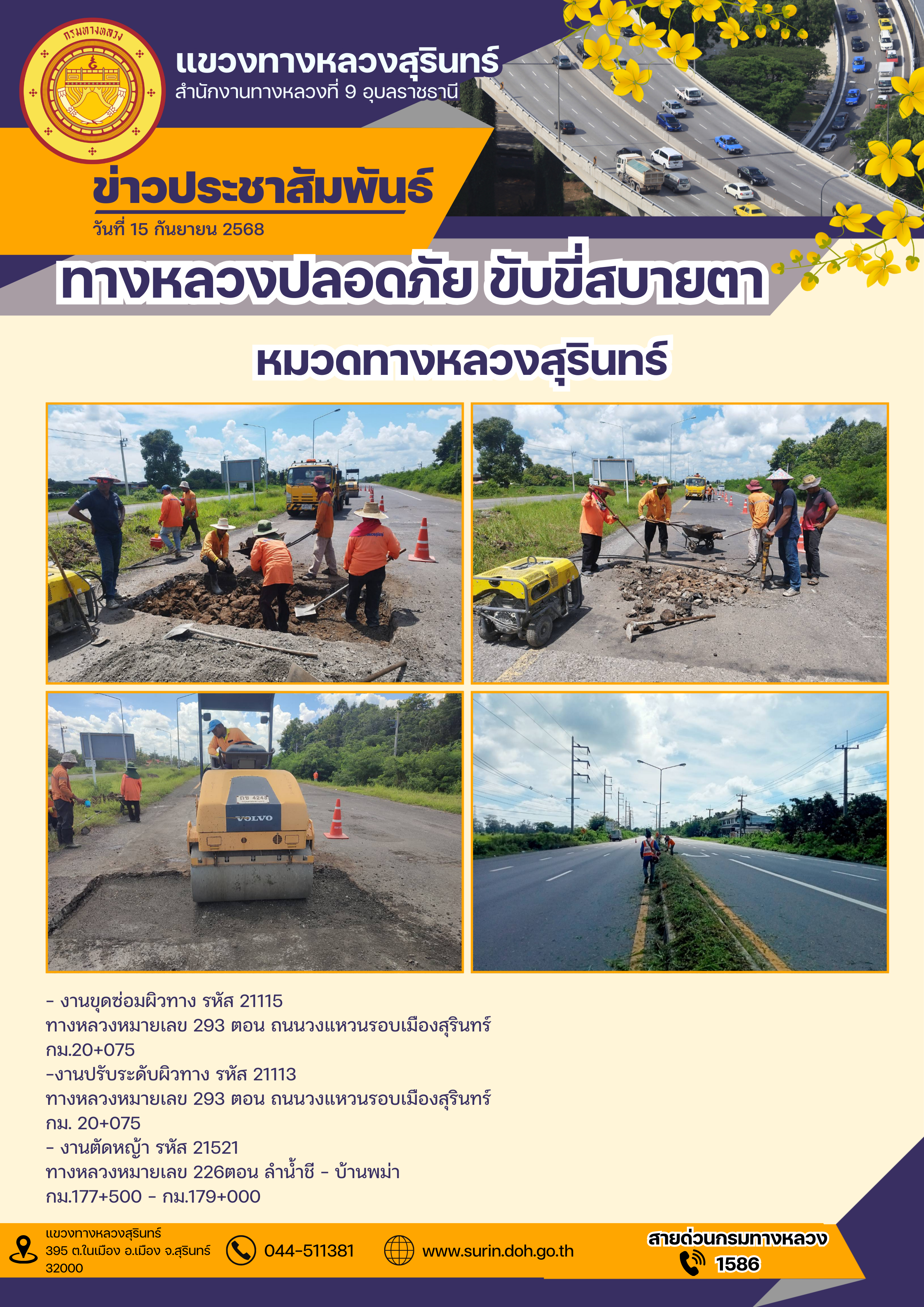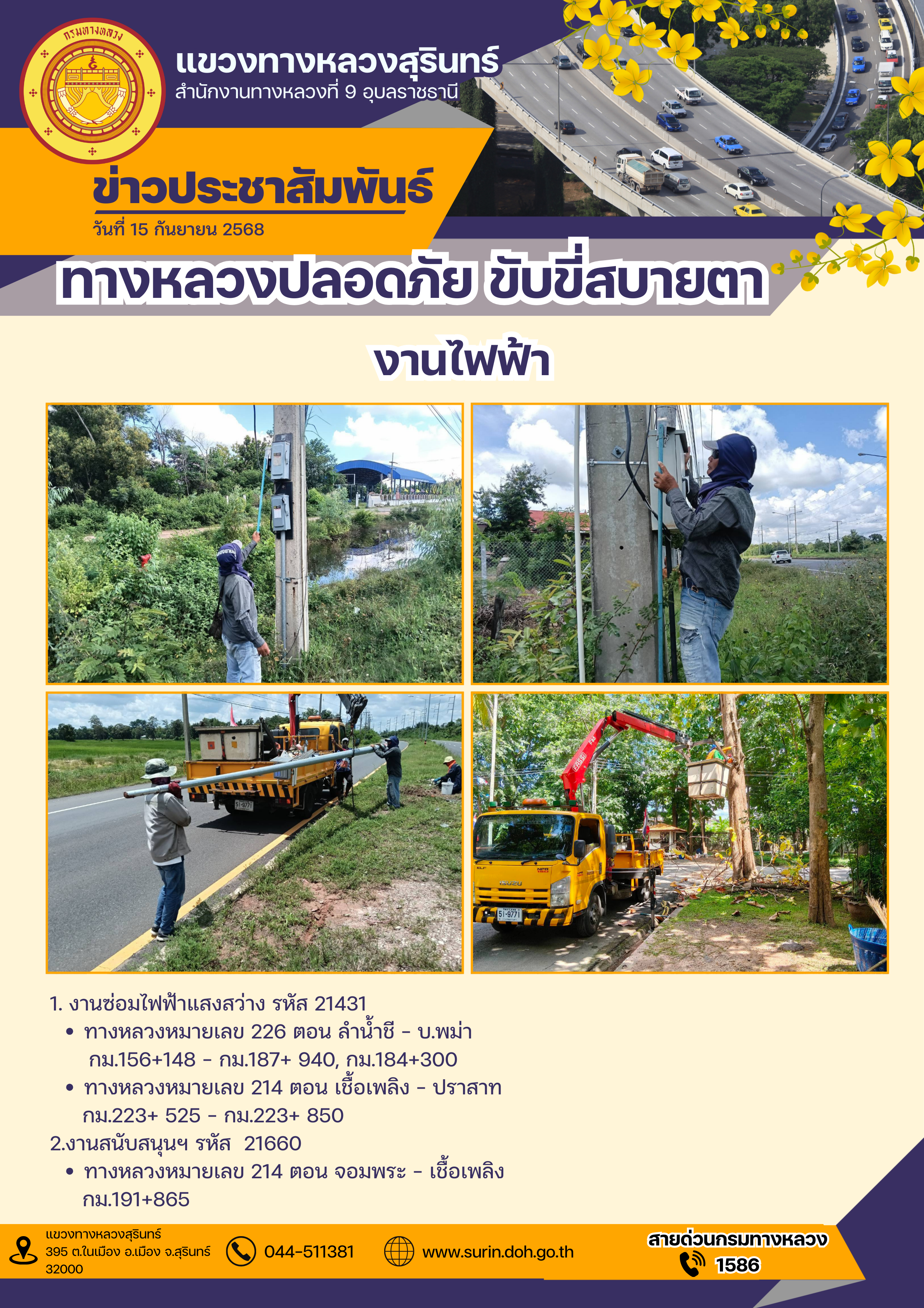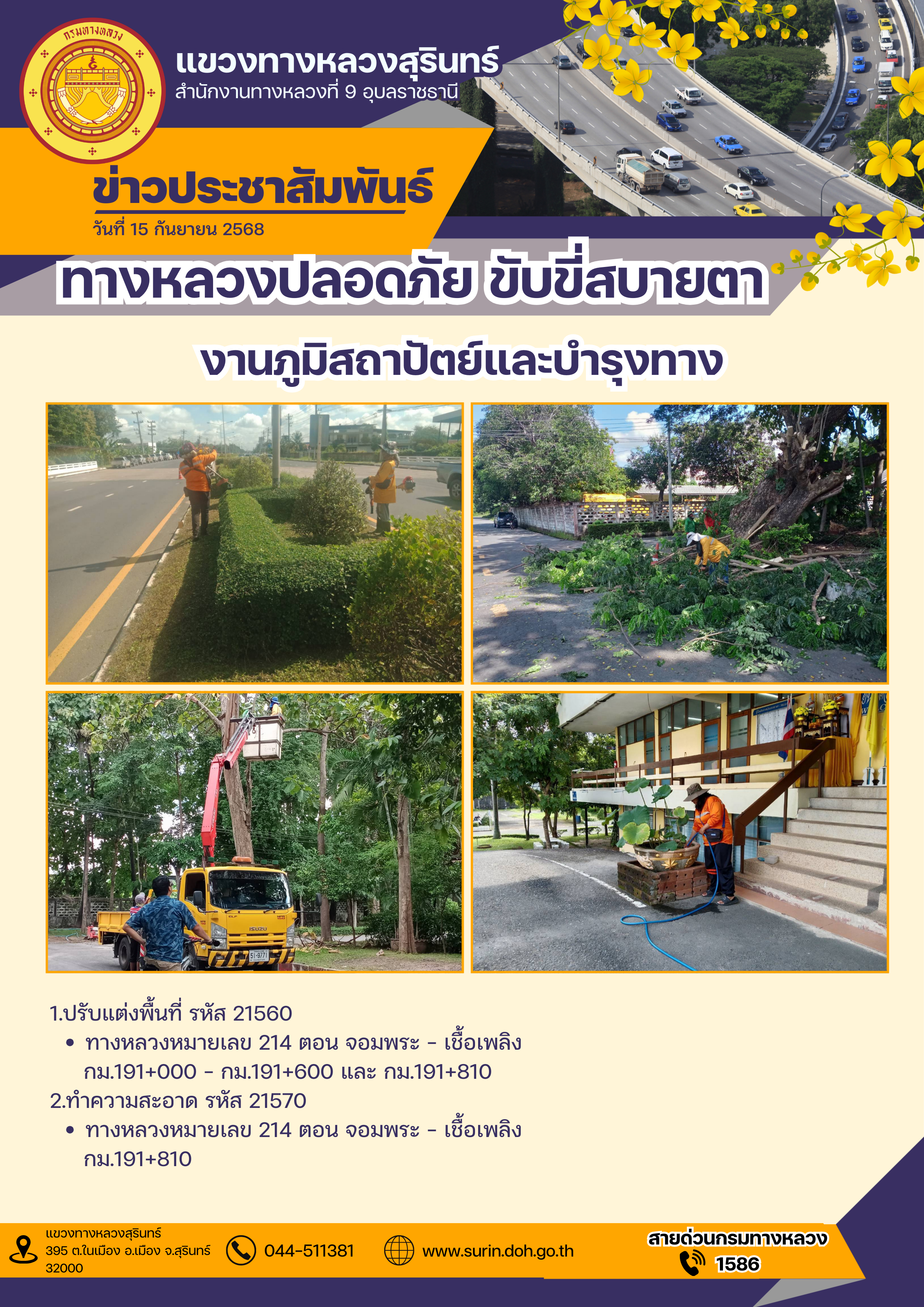 ข้อมูลข่าว : ทางหลวงปลอดภัย ขับขี่สบายตา 15 กันยายน 2568