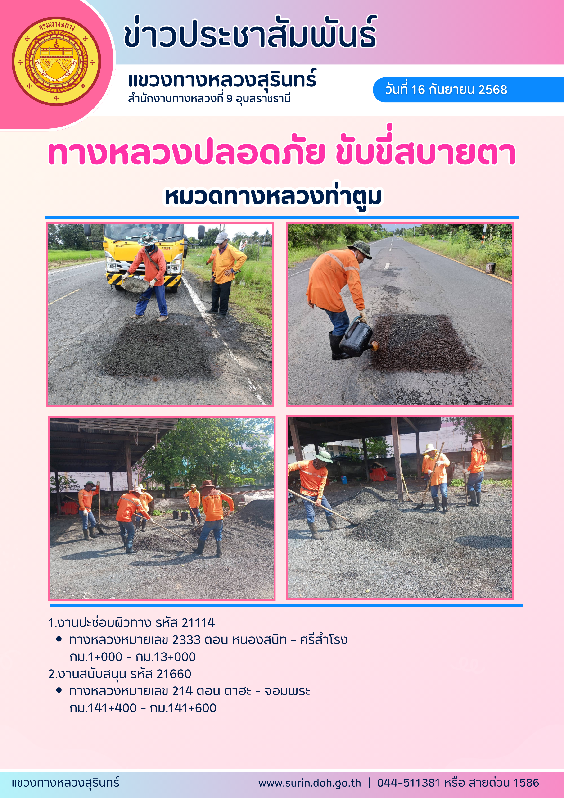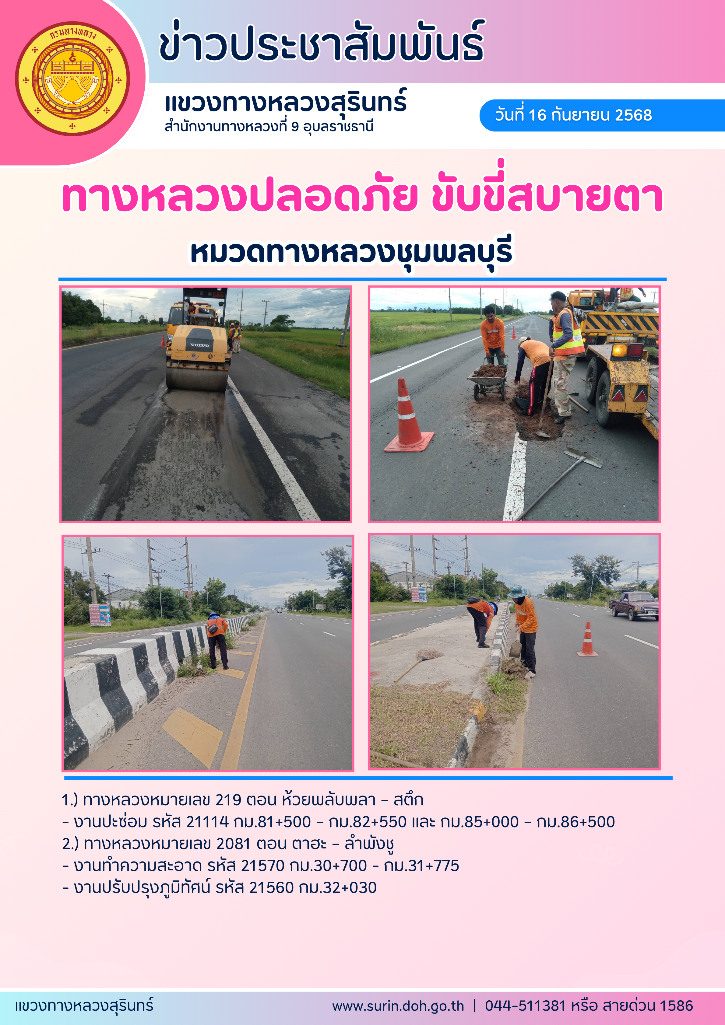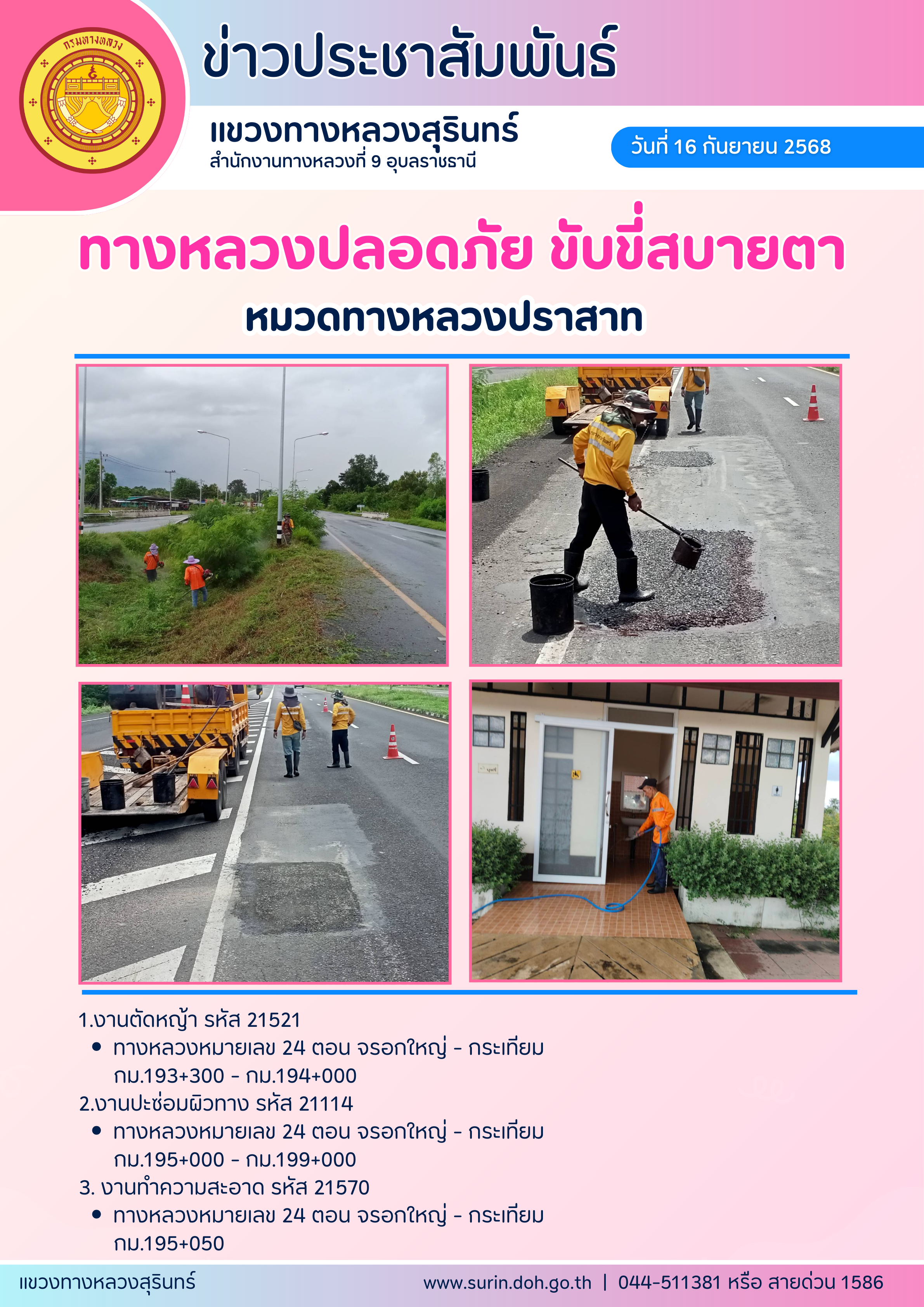 ข้อมูลข่าว : ทางหลวงปลอดภัย ขับขี่สบายตา 16 กันยายน 2568
