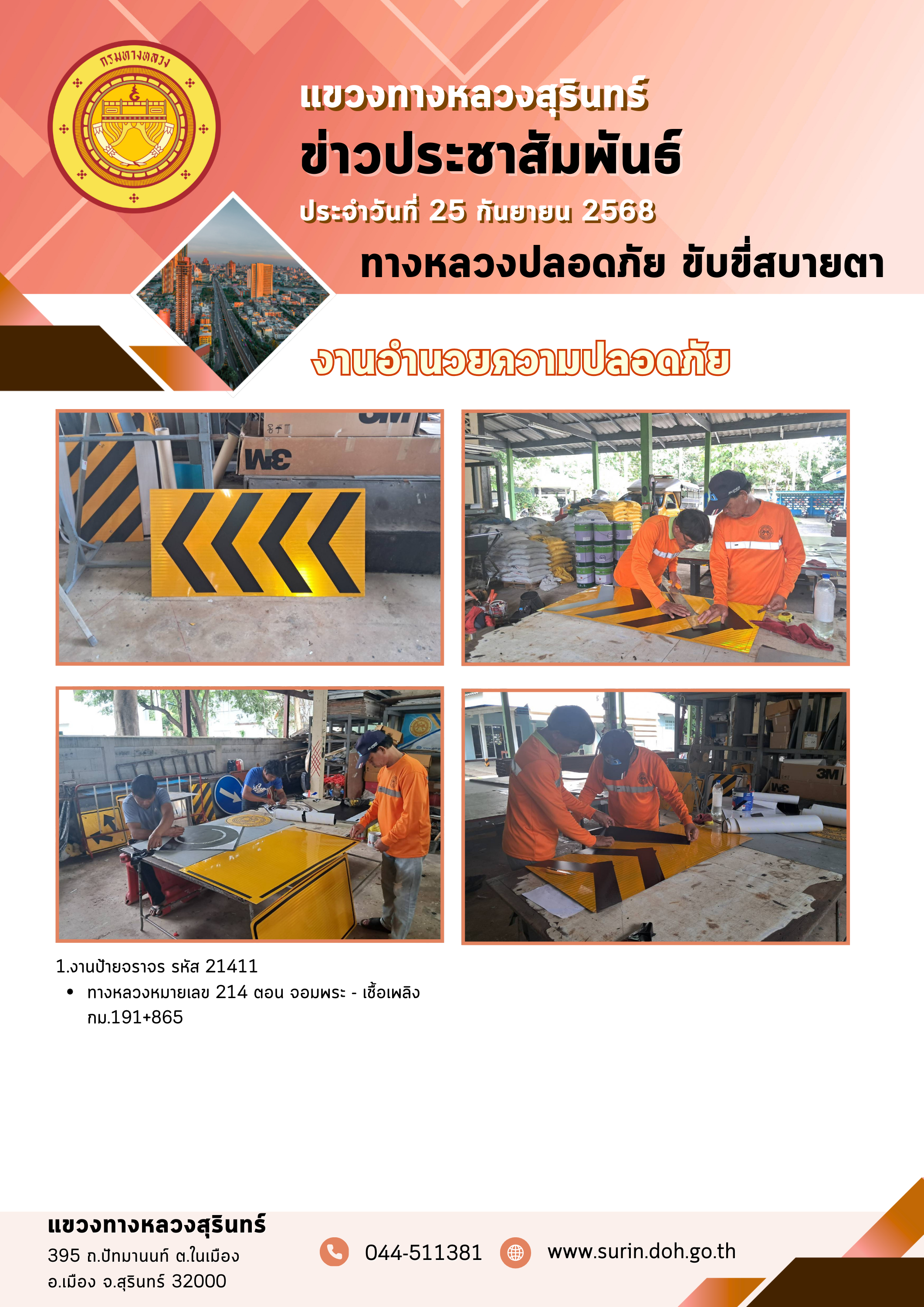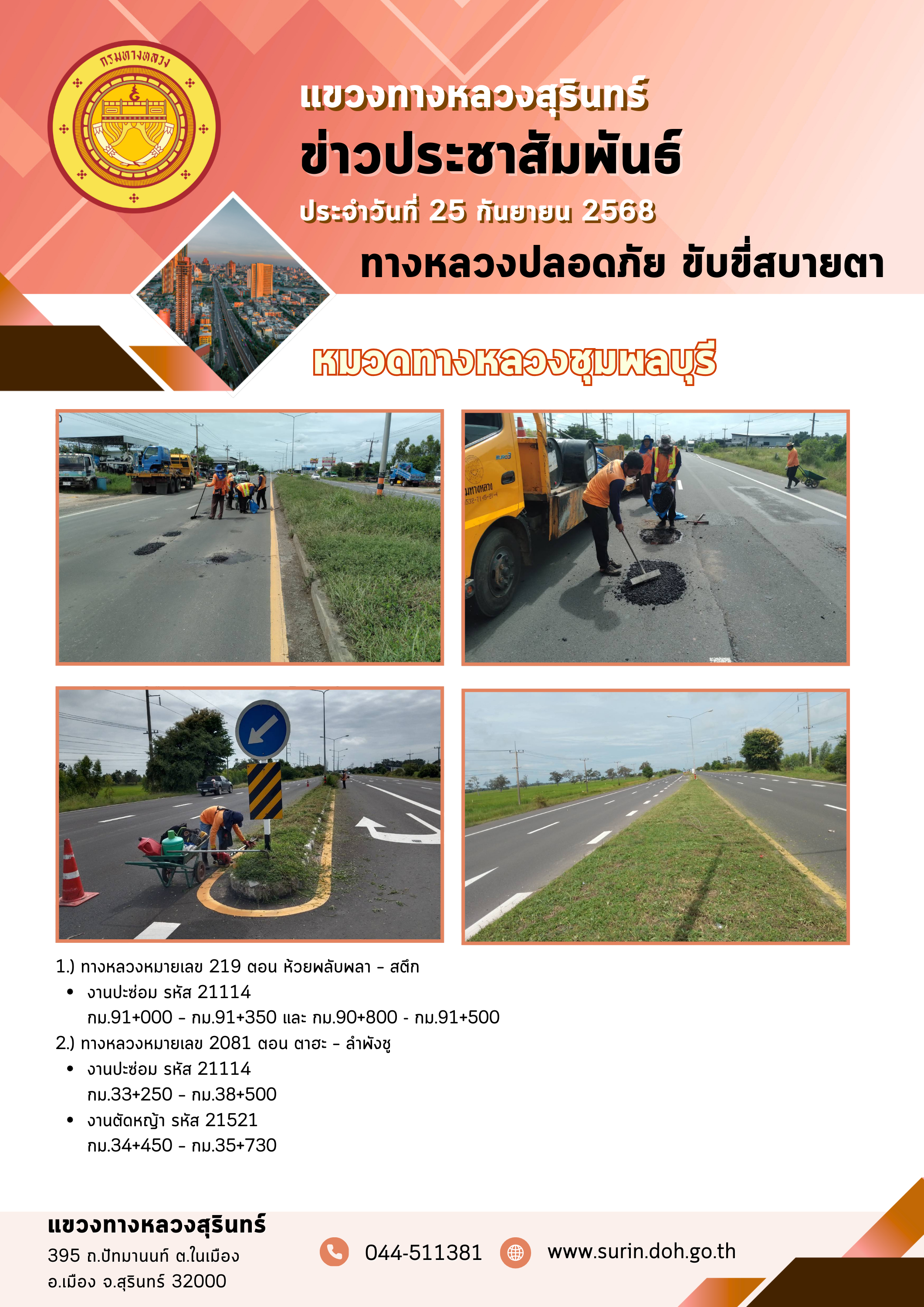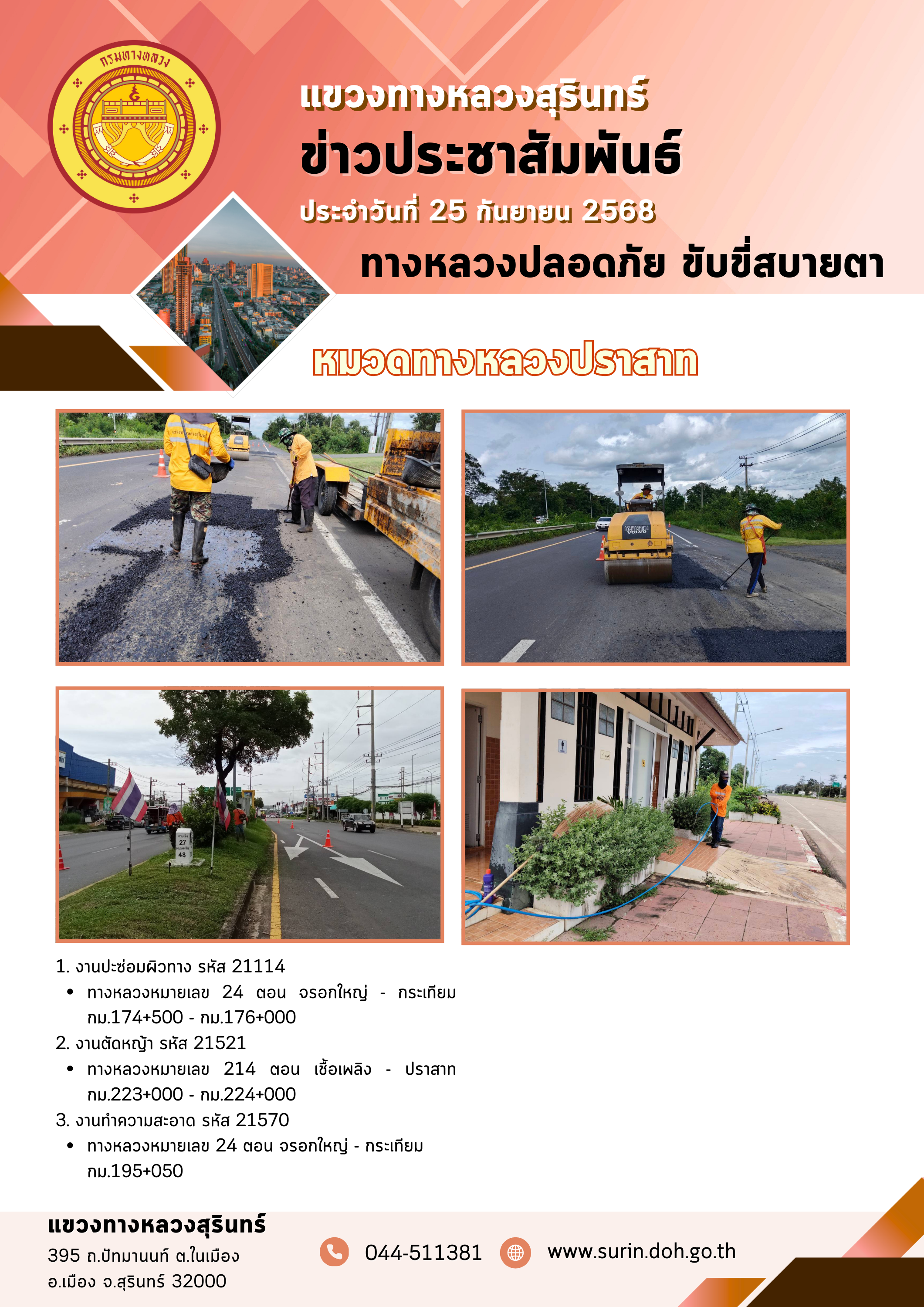 ข้อมูลข่าว : ทางหลวงปลอดภัย ขับขี่สบายตา 25 กันยายน 2568