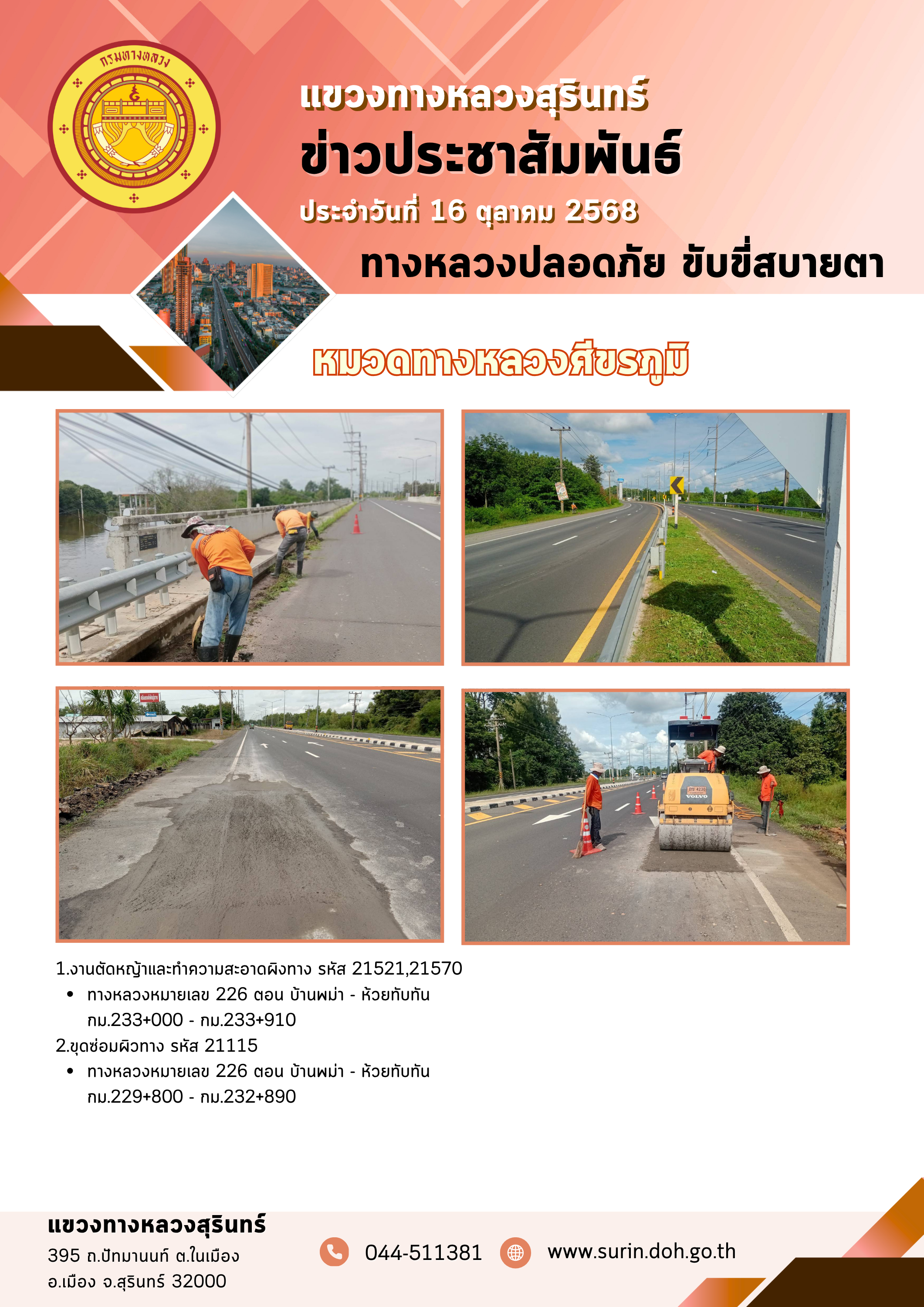 ข้อมูลข่าว : ทางหลวงปลอดภัย ขับขี่สบายตา 16 ตุลาคม 2568