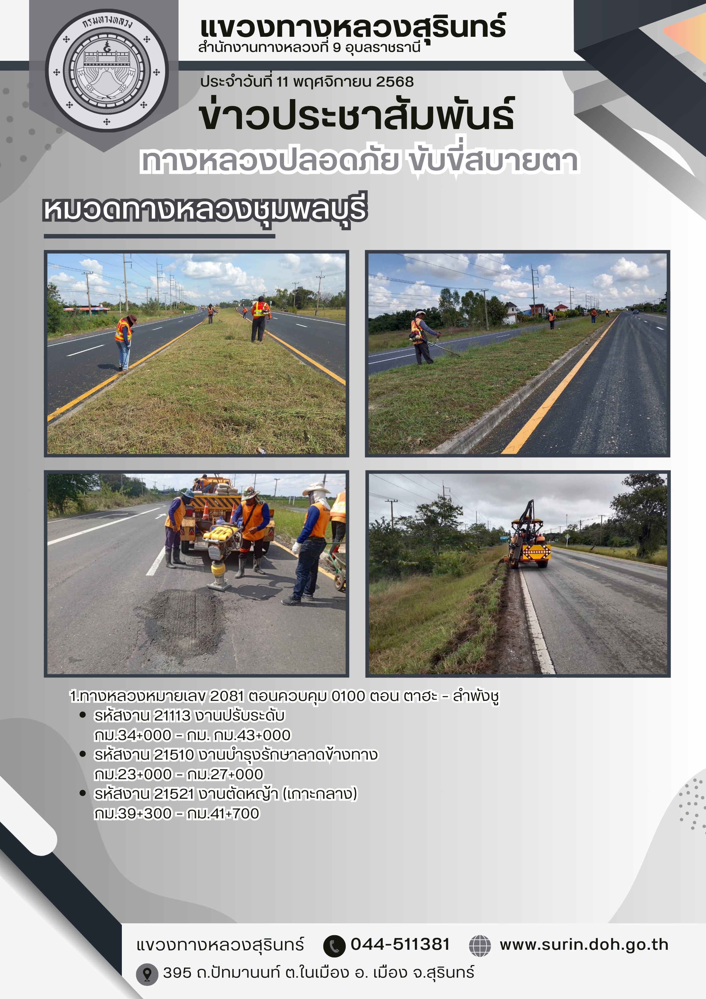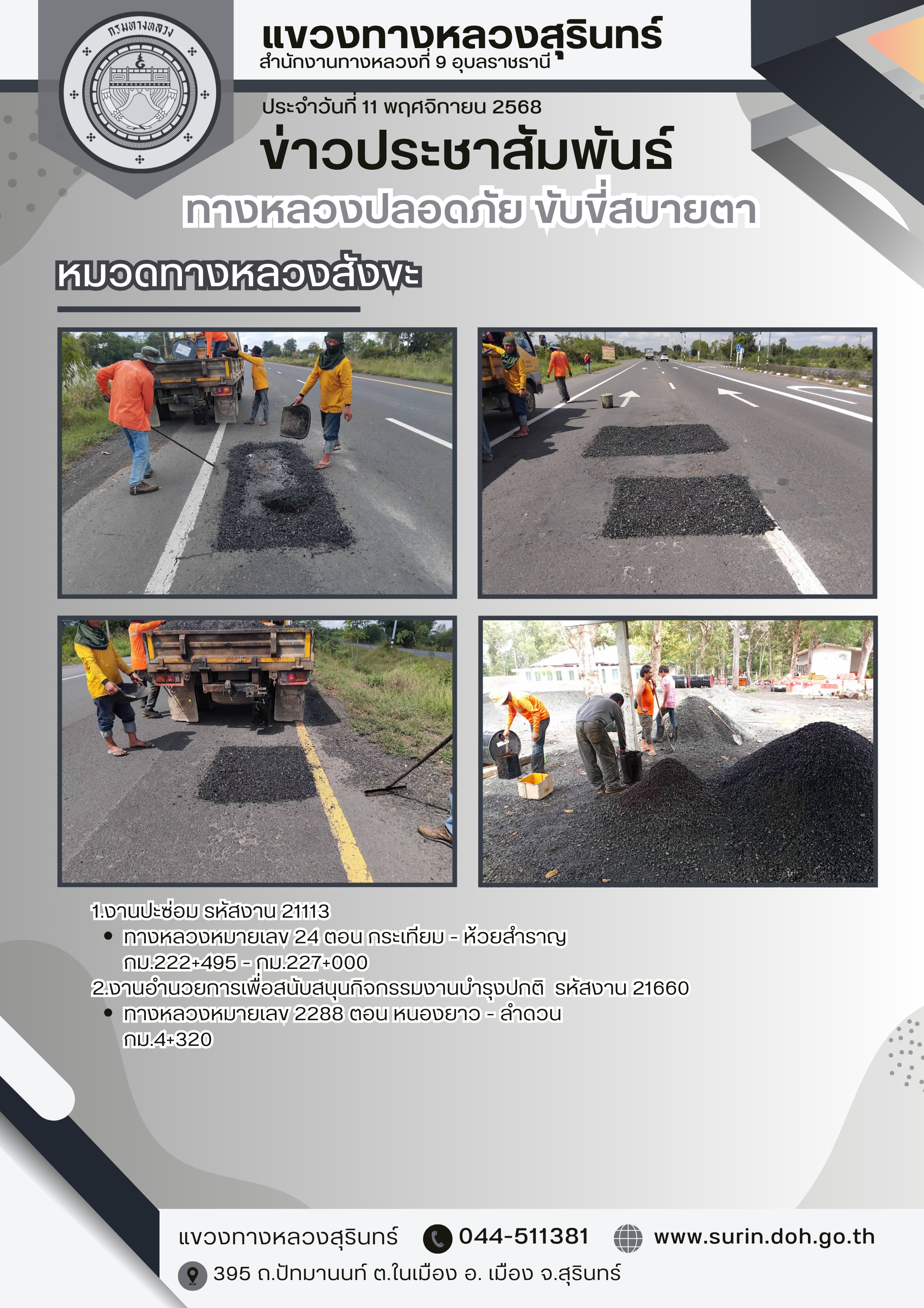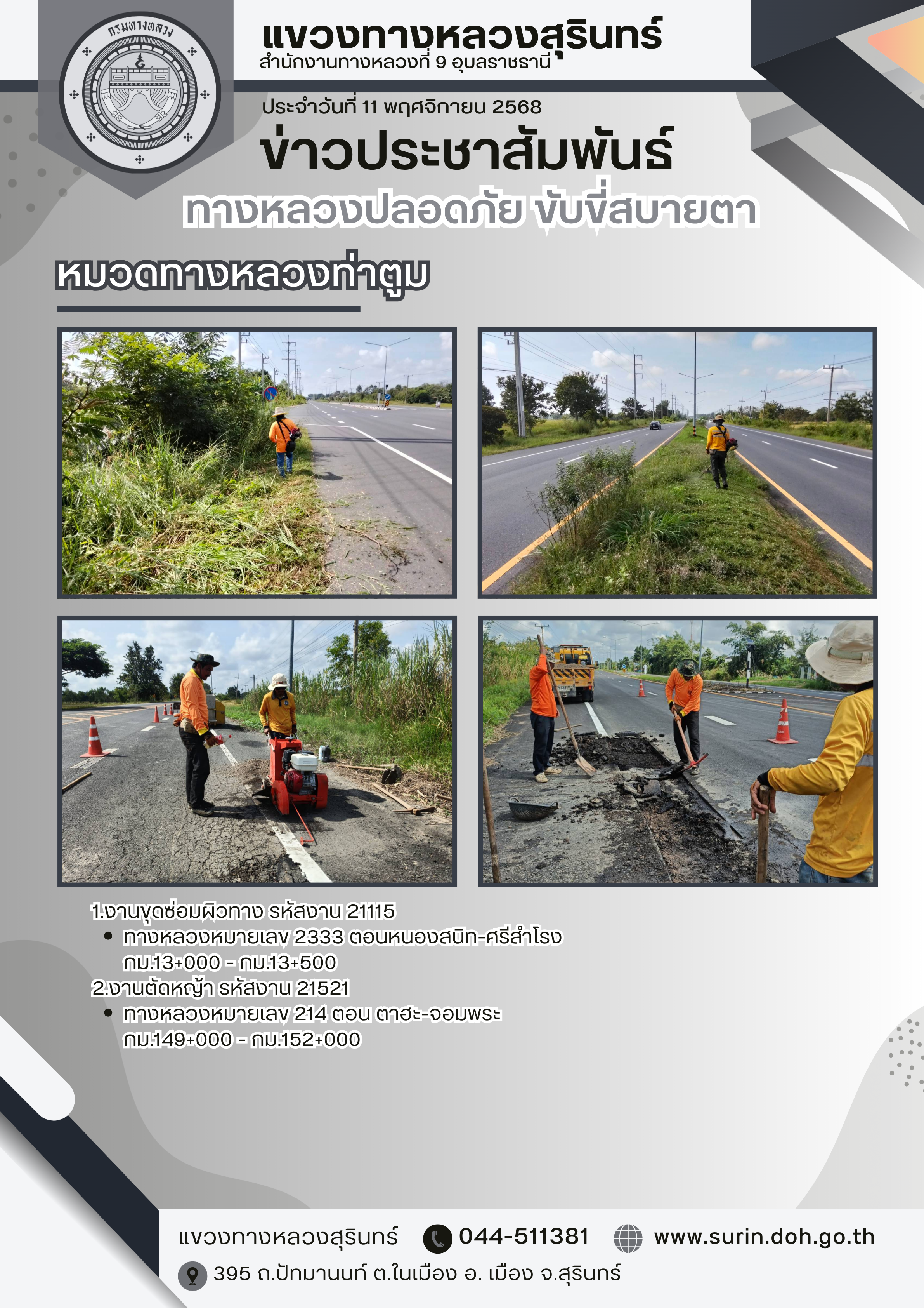 ข้อมูลข่าว : ทางหลวงปลอดภัย ขับขี่สบายตา 11 พฤศจิกายน 2568