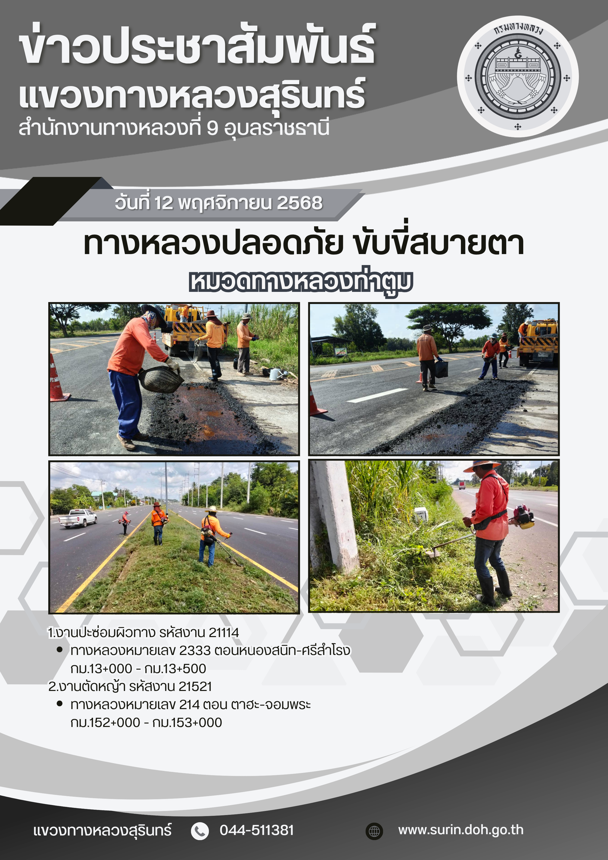 ข้อมูลข่าว : ทางหลวงปลอดภัย ขับขี่สบายตา 12 พฤศจิกายน 2568