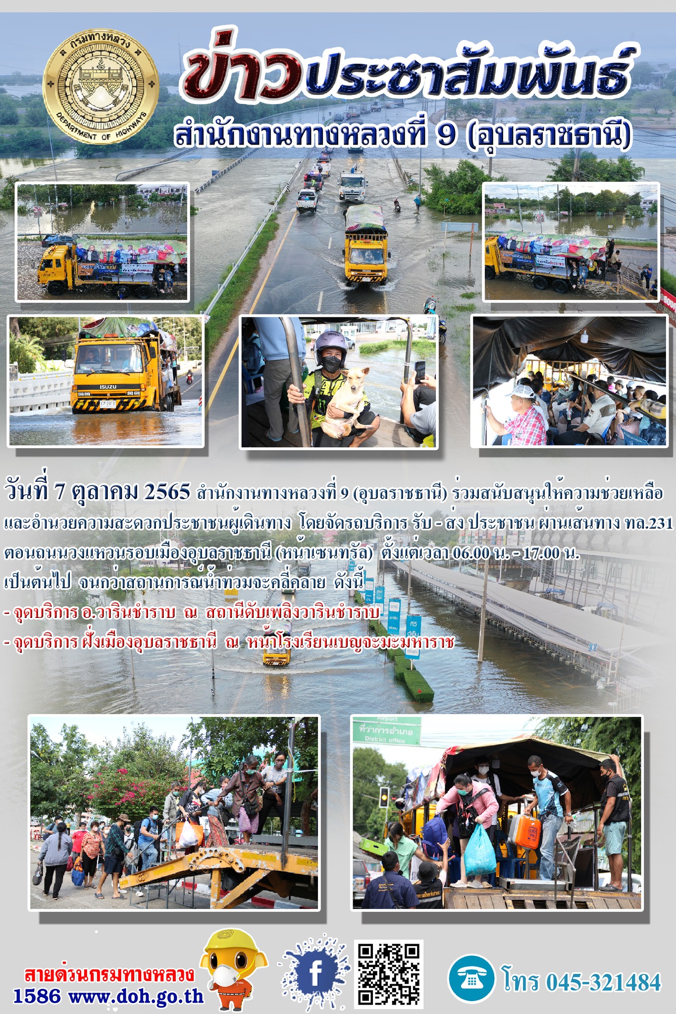 วันที่ 7 ตุลาคม 2565 สำนักงานทางหลวงที่ 9 (อุบลราชธานี) ร่วมสนับสนุนให้ความช่วยเหลือและอำนวยความสะดวกประชาชนผู้เดินทาง โดยจัดรถบริการ รับ - ส่ง ประชาชน ผ่านเส้นทาง ทางหลวงหมายเลข 231 ตอนถนนวงแหวนรอบเมืองอุบลราชธานี (หน้าเซ็นทรัล) ตั้งแต่เวลา 06.00 น. - 17.00 น. เป็นต้นไป จนกว่าสถานการณ์น้ำท่วมจะคลี่คลาย ดังนี้