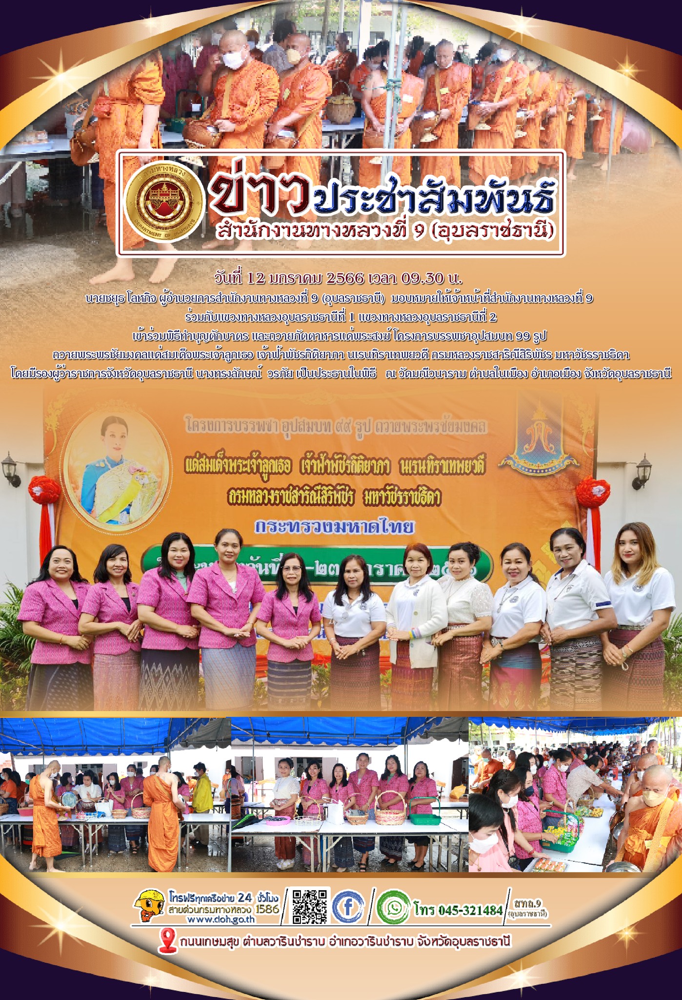 วันที่ 12 มกราคม 2566 เวลา 09.30 น. นายชยุธ โลหกิจ ผู้อำนวยการสำนักงานทางหลวงที่ 9 (อุบลราชธานี) มอบหมายให้เจ้าหน้าที่สำนักงานทางหลวงที่ 9 ร่วมกับแขวงทางหลวงอุบลราชธานีที่ 1 แขวงทางหลวงอุบลราชธานีที่ 2 เข้าร่วมพิธีทำบุญตักบาตร และถวายภัตตาหารแด่พระสงฆ์ โครงการบรรพชาอุปสมบท 99 รูป ถวายพระพรชัยมงคลแด่สมเด็จพระเจ้าลูกเธอ เจ้าฟ้าพัชรกิติยาภา นเรนทิราเทพยวดี กรมหลวงราชสาริณีสิริพัชร มหาวัชรราชธิดาโดยมีรองผู้ว่าราชการจังหวัดอุบลราชธานี นางทรงลักษณ์ วรภัย เป็นประธานในพิธี ณ วัดมณีวนาราม ตำบลในเมือง อำเภอเมือง จังหวัดอุบลราชธานี