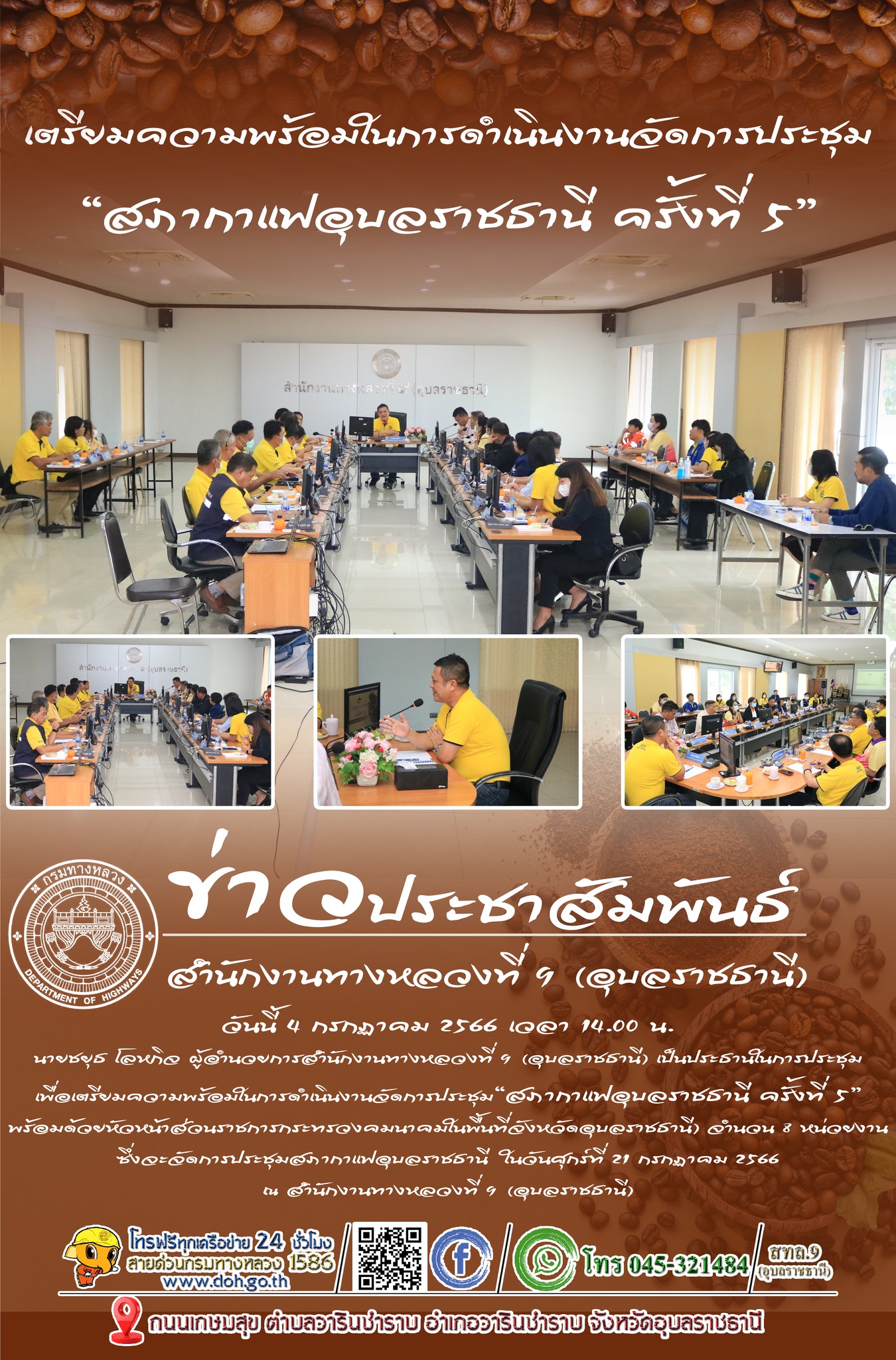 วันนี้ 4 กรกฏาคม 2566 เวลา 14.00 น. นายชยุธ โลหกิจ ผู้อำนวยการสำนักงานทางหลวงที่ 9 (อุบลราชธานี) เป็นประธานในการประชุมเพื่อเตรียมความพร้อมในการดำเนินงานจัดการประชุม“สภากาแฟอุบลราชธานี ครั้งที่ 5” พร้อมด้วยหัวหน้าส่วนราชการกระทรวงคมนาคมในพื้นที่จังหวัดอุบลราชธานี) จำนวน 8 หน่วยงานซึ่งจะจัดการประชุมสภากาแฟอุบลราชธานี ในวันศุกร์ที่ 21 กรกฏาคม 2566 ณ สำนักงานทางหลวงที่ 9 (อุบลราชธานี)