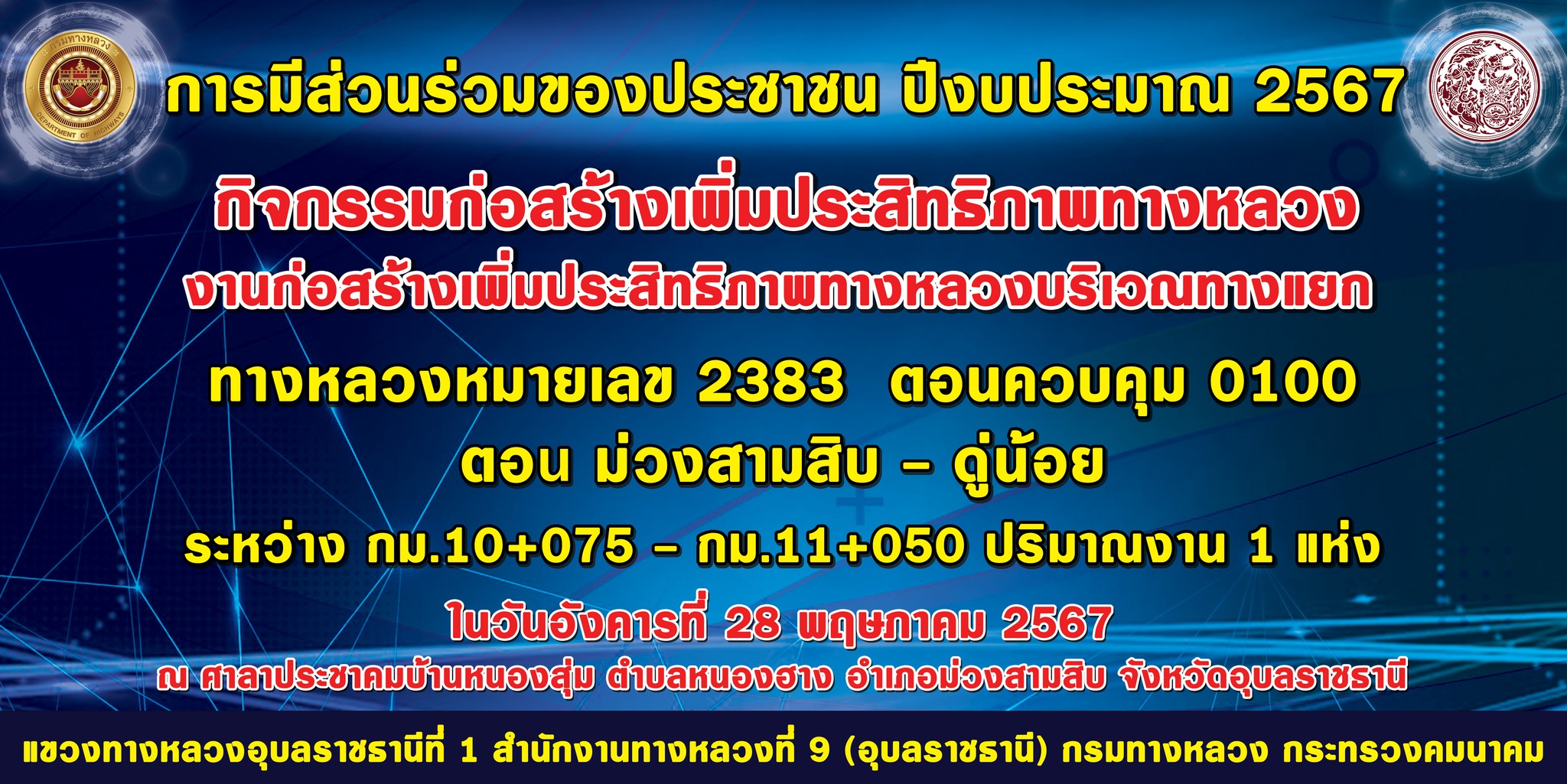 ขอเชิญประชาชนผู้สนใจเข้าร่วมรับฟังและแสดงความคิดเห็น “การประชุมการมีส่วนร่วมของประชาชน ปีงบประมาณ 2567 กิจกรรมก่อสร้างเพิ่มประสิทธิภาพทางหลวง งานก่อสร้างเพิ่มประสิทธิภาพทางหลวงบริเวณทางแยก ทางหลวงหมายเลข 2383 ตอนควบคุม 0100 ตอน ม่วงสามสิบ - ดู่น้อย ระหว่าง กม.10+075 - กม.11+050