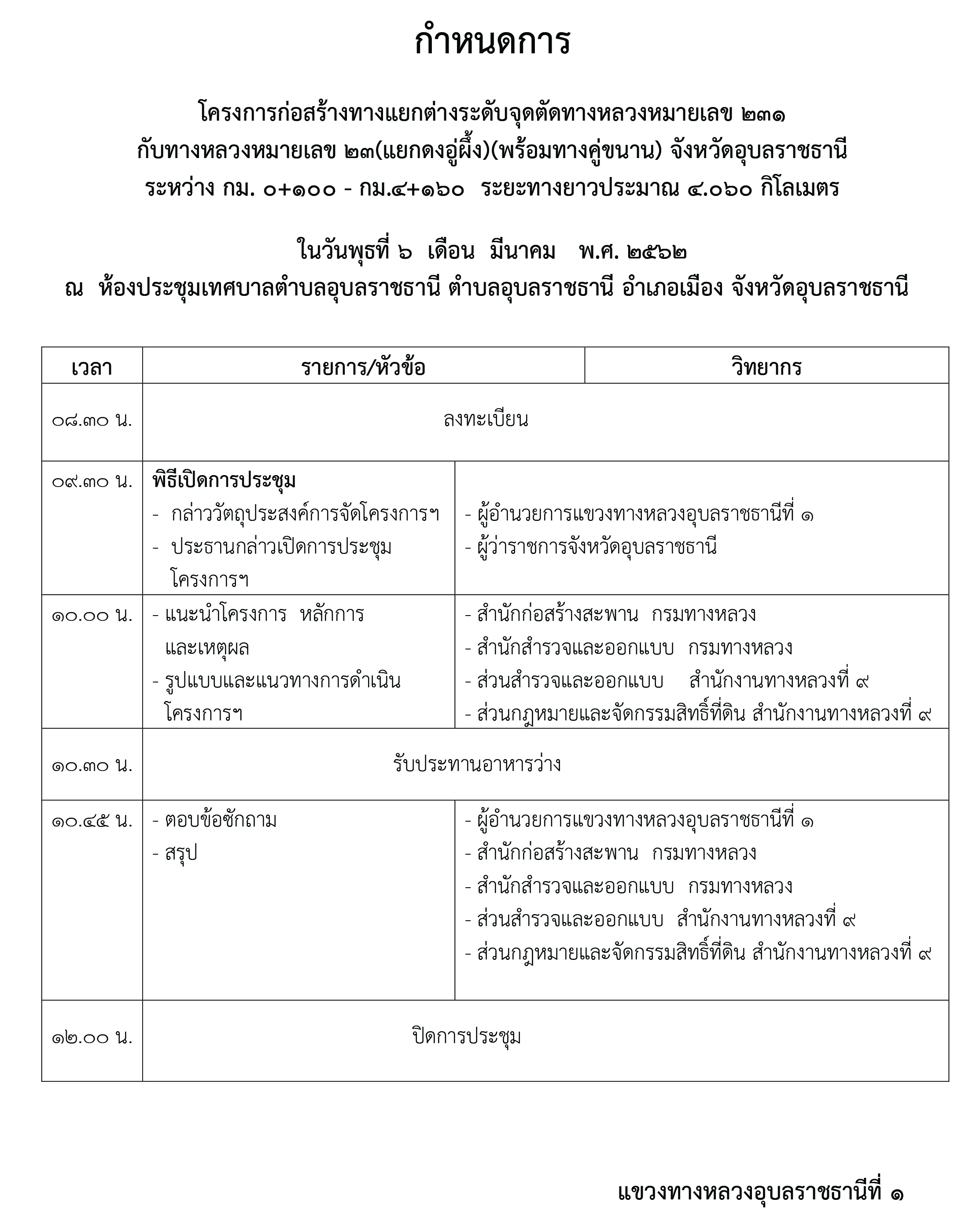 ขอเชิญประชาชนในพื้นที่ ตำบลในเมือง, ตำบลอุบลราชธานี, ตำบลแจระแม, ตำบลขามใหญ่และผู้มีส่วนได้ส่วนเสีย รวมทั้งผู้สนใจเข้าร่วมประชุมการมีส่วนร่วมของประชาชนเพื่อรับฟังการชี้แจงรายละเอียดโครงการก่อสร้างทางหลวงแผ่นดินทางหลวงหมายเลข 231 กับทางหลวงหมายเลข 23 (แยกดงอู่ผึ้ง)(พร้อมทางคู่ขนาน) จังหวัดอุบลราชธานี ณ ห้องประชุมเทศบาลตำบลอุบลราชธานี ตำบลอุบลราชธานี อำเภอเมือง จังหวัดอุบลราชธานี