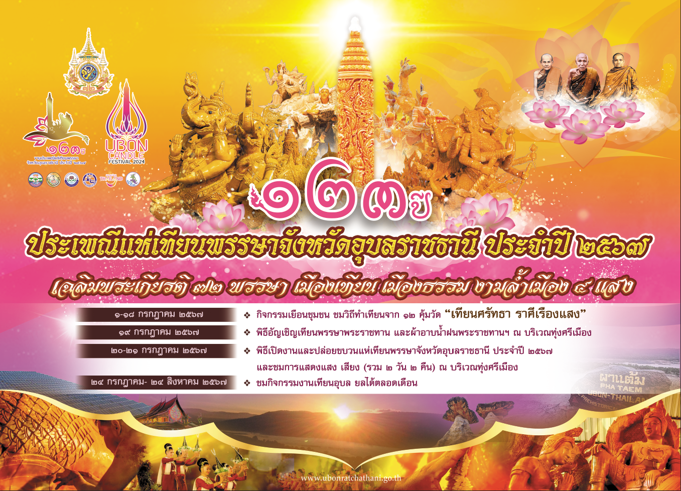 งานประเพณีแห่เทียนพรรษาจังหวัดอุบลราชธานี ประจำปี2567ระหว่างวันที่ 17-23 กรกฏาคม2567
