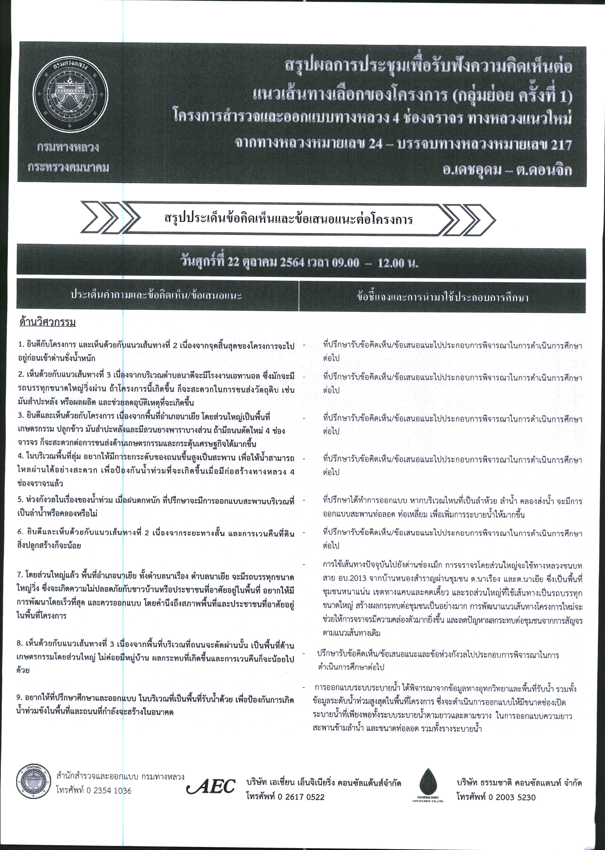สรุปผลการประชุมเพื่อรับฟังความคิดเห็นต่อแนวทางเลือกของโครงการ (กลุ่มย่ิย ครั้งที่ 1) โครงการสำรวจและออกแบบทางหลวง 4 ช่องจราจร