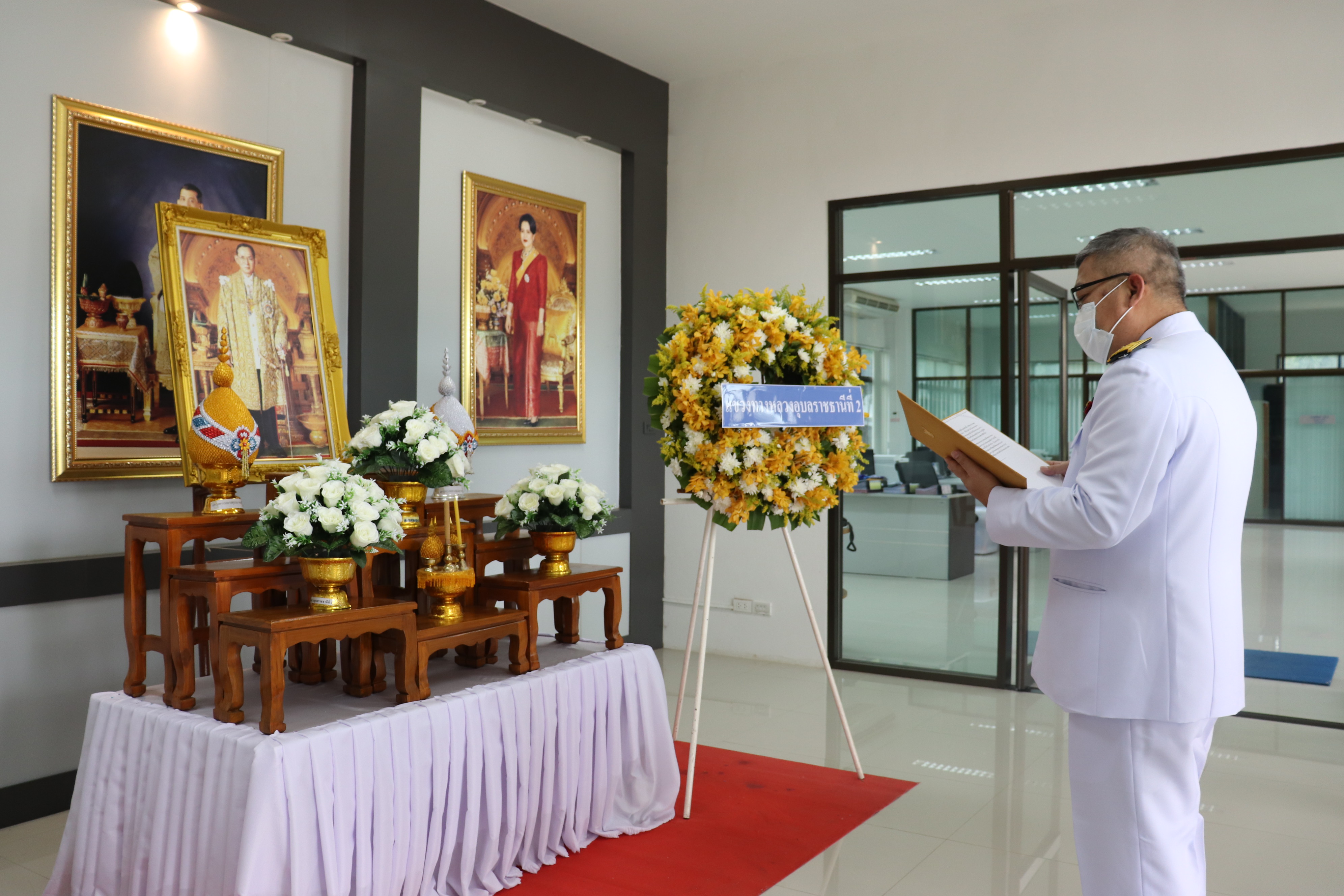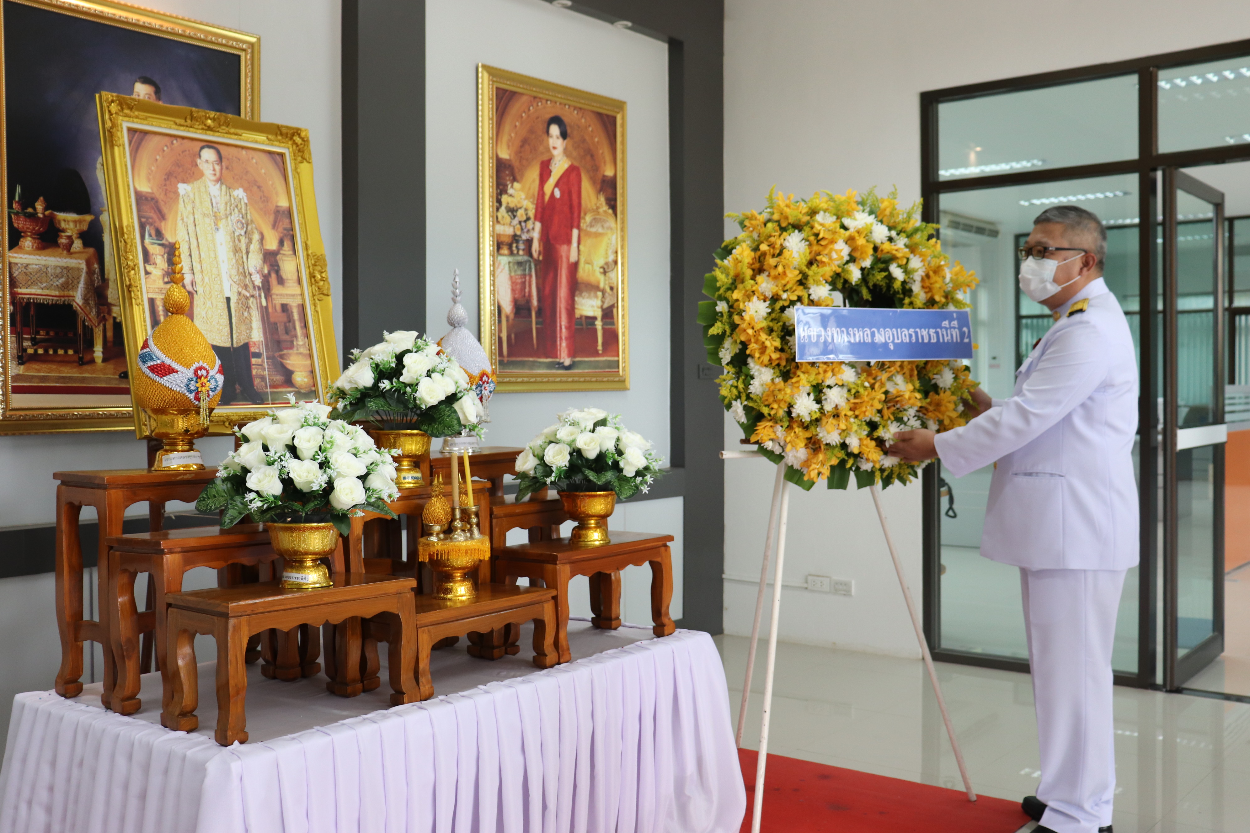 นำคณะข้าราชการ และ เจ้าหน้าที่ทำพิธีวางพวงมาลาน้อมรำลึกในพระมหากรุณาธิคุณ เนื่องในวันคล้ายวันสวรรคต พระบาทสมเด็จพระบรมชนกาธิเบศร มหาภูมิพลอดุลยเดชมหาราช บรมนาถบพิตร ณ แขวงทางหลวงอุบลราชธานีที่ ๒