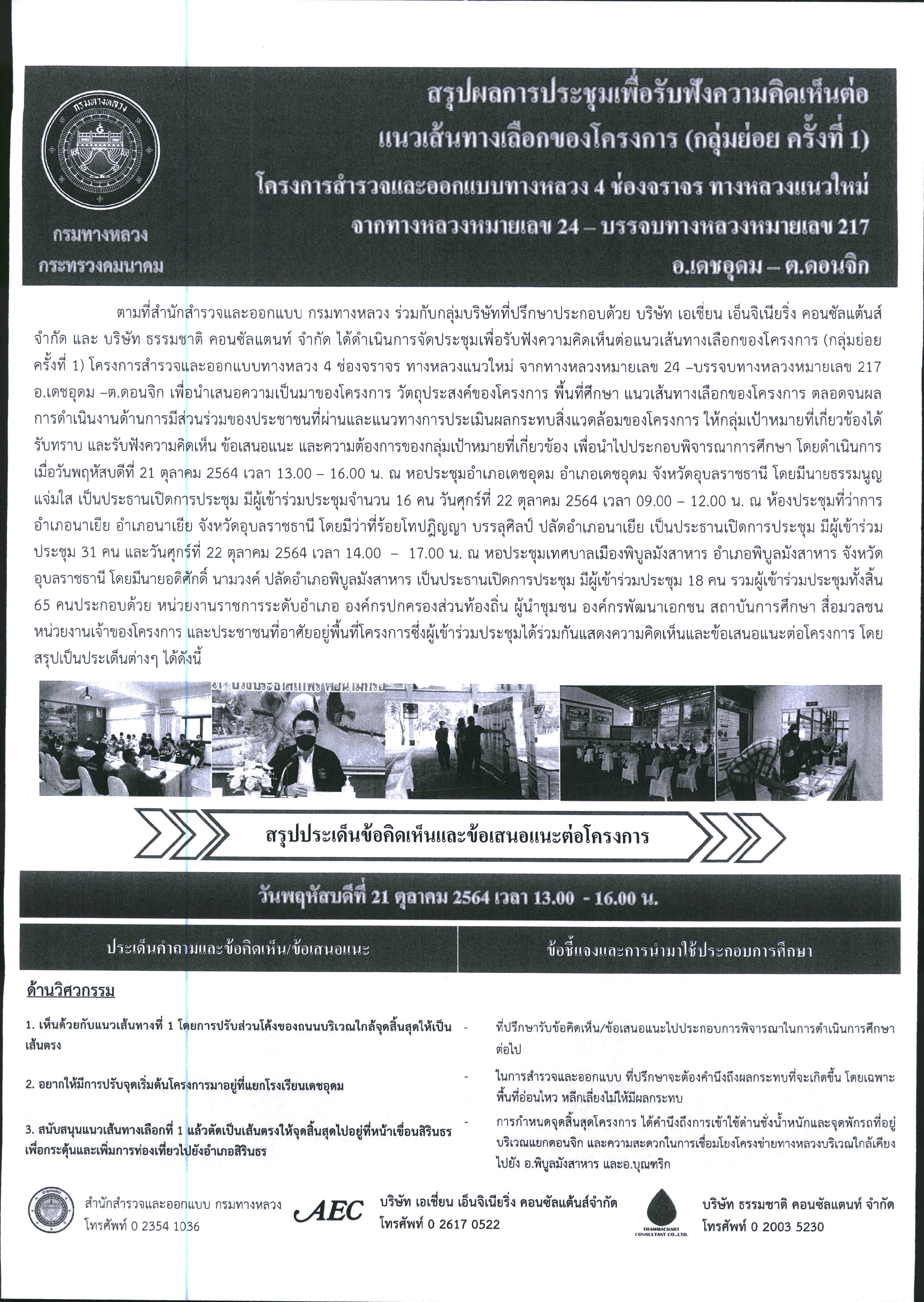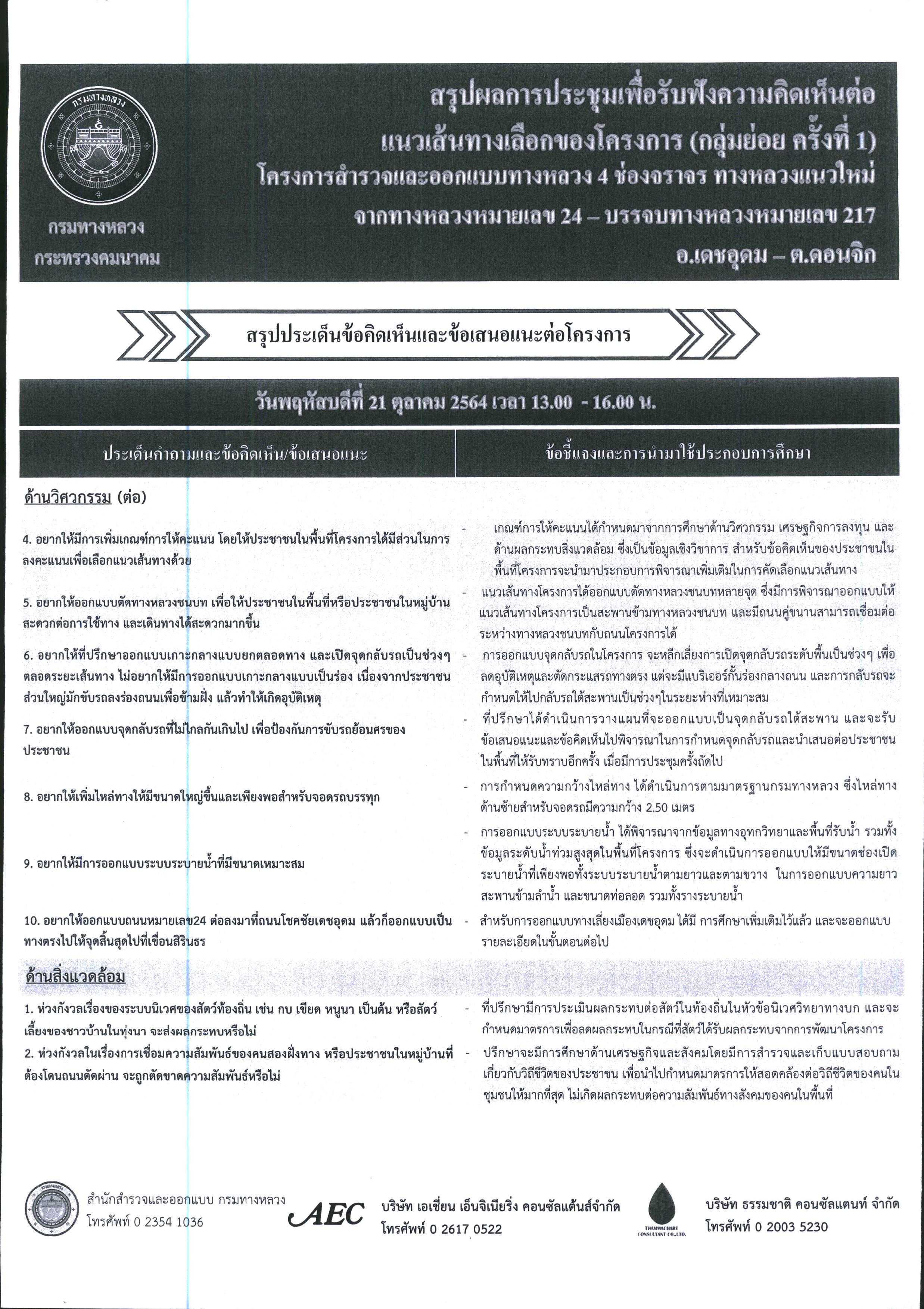 สรุปผลการประชุมเพื่อรับฟังความคิดเห็นต่อแนวทางเลือกของโครงการ (กลุ่มย่อย ครั้งที่ 1) โครงการสำรวจและออกแบบทางหลวง 4 ช่องจราจร ทางหลวงแนวใหม่