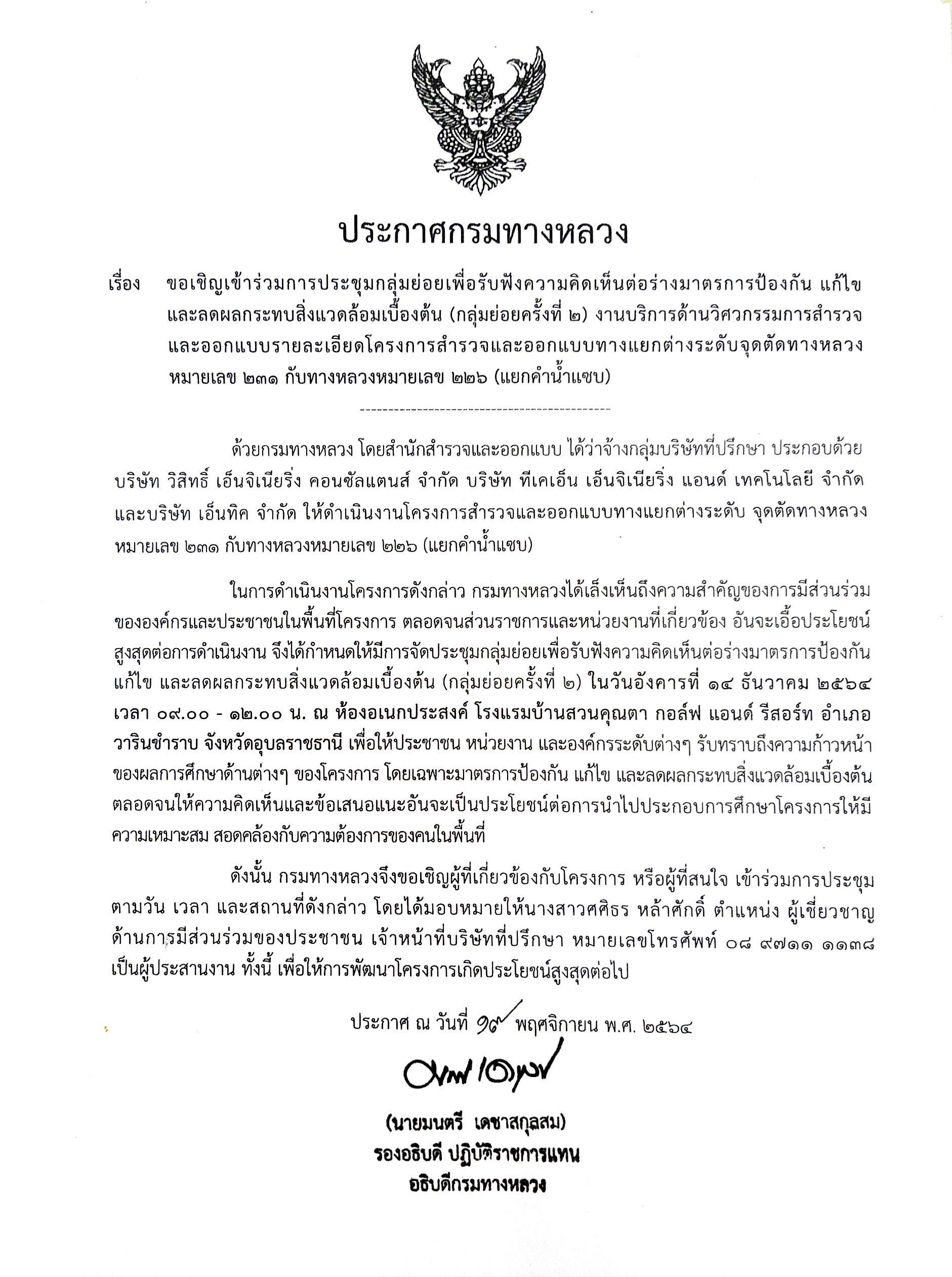 ขอเชิญเข้าร่วมประชุมกลุ่มย่อย เพื่อรับฟังความคิดเห็นต่อร่างมาตรการป้องกันแก้ไขและลดผลกระทบสิ่งแวดล้อมเบื้องต้น (กลุ่มย่อย ครั้งที่ 2)