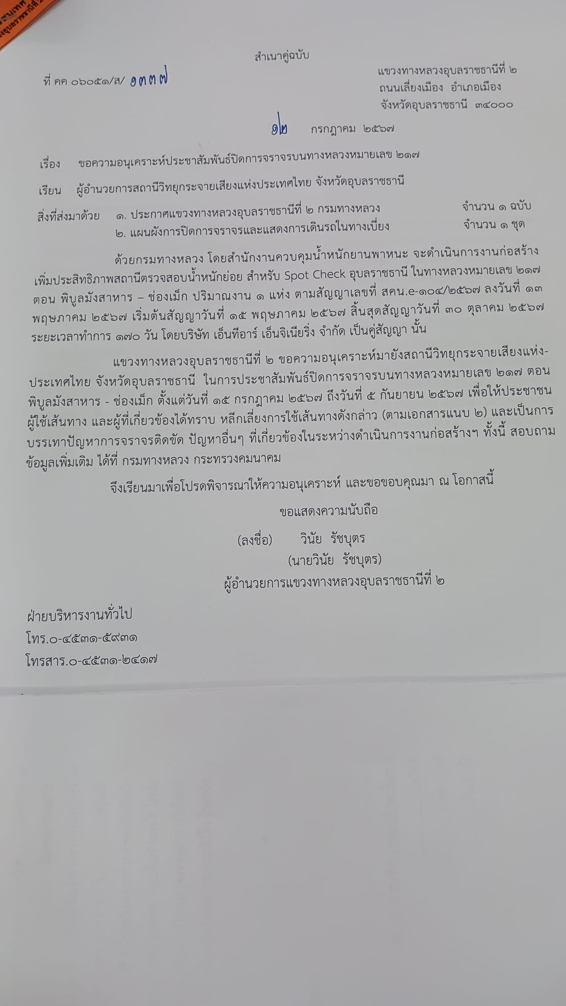 แขวงทางหลวงอุบลราชธานีที่2จะดำเนินการปิดการจราจรบนทางหลวงหมายเลข217 ตอน พิบูลมังสาหาร-ช่องเม็ก ตั้งแต่วันที่ 15 กรกฎาคม 2567-5กันยายน 2567 เพื่อให้ประชาชนผู้ใช้เส้นทางและผู้ที่เกี่ยวข้องได้ทราบ หลีกเลี่ยงการใช้เส้นทางดังกล่าว