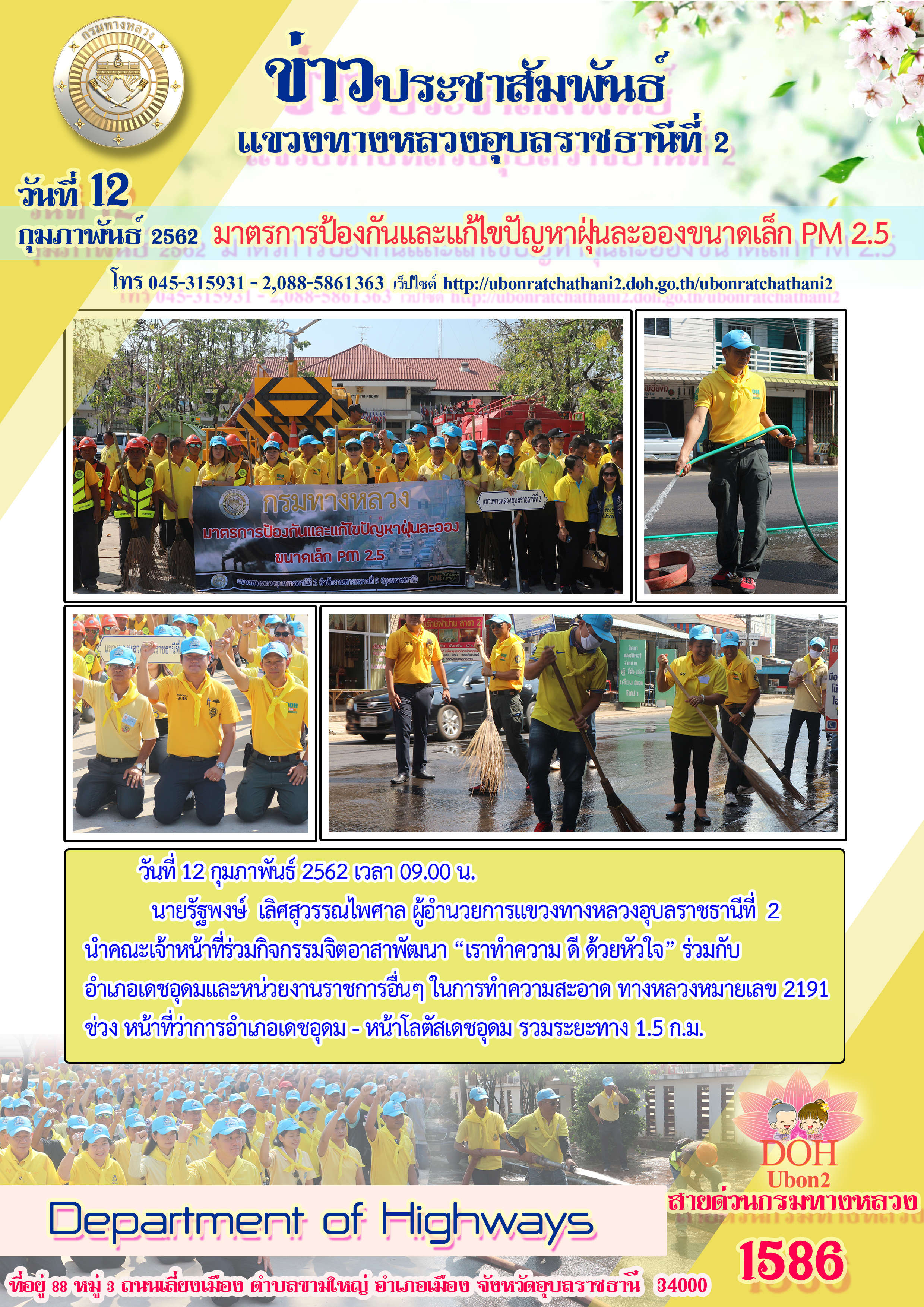 นายรัฐพงษ์ เลิศสวรรณไพศาล ผู้อำนวยการแขวงทางหลวงอุบลราชธานีที่ 2 นำคณะเจ้าหน้าที่ร่วมกิจกรรมจิตอาสาพัฒนา "เราทำความ ดี ด้วยหัวใจ"ร่วมกับอำเภอเดชอุดมและหน่วยงานราชการอื่นๆ ในการทำความสะอาด ทางหลวงหมายเลข 2191 ช่วง หน้าที่ว่าการอำเภอเดชอุดม - หน้าโลตัสเดชอุดม รวมระยะทาง 1.5 กม.